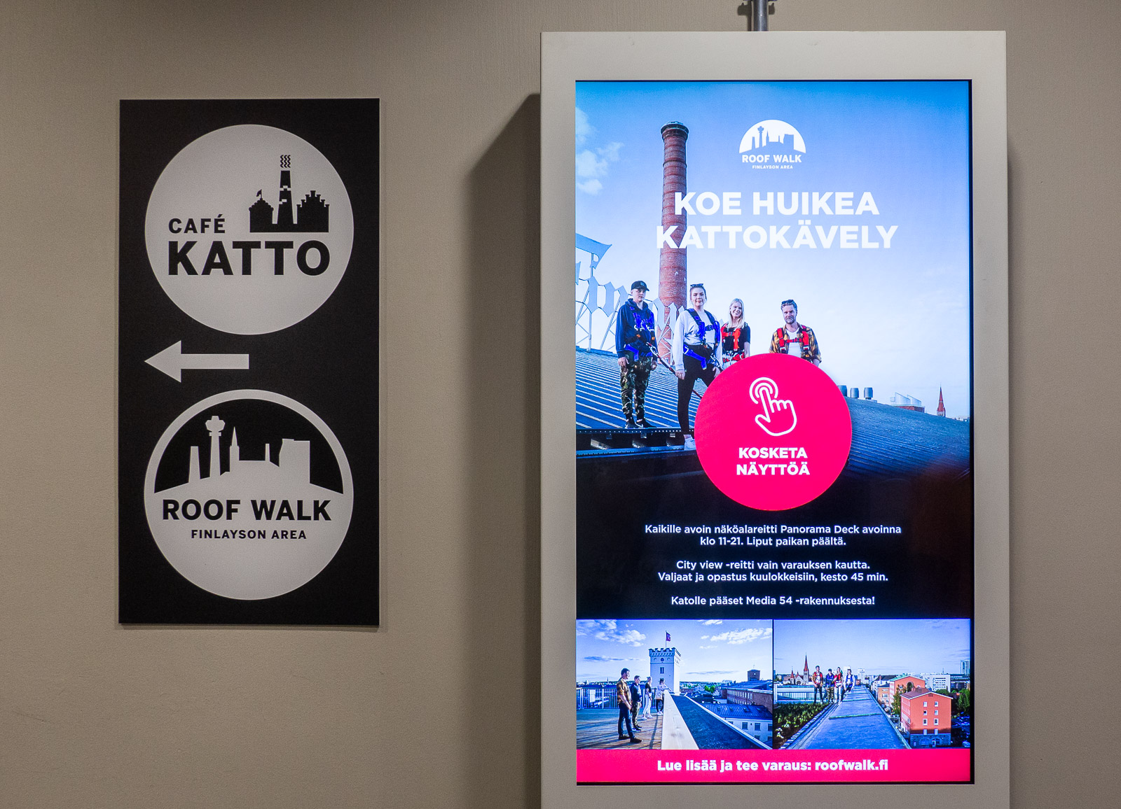 Ensimmäisen pienen haasteen, ainakin satunnaiselle turistille, tarjosi katon löytäminen. Ohjeet neuvoivat etsimään hissiä joko Siperian reunalta tai Media 54:n sisäänkäynniltä. Siperia osoittautui liian laajaksi kohteeksi, mutta Media 54:n sisäänkäynti löytyi Satakunnankatu 18:n kohdalta Kaarina Kaikkosen takkien alta. Ylös korkeuksiin siis!