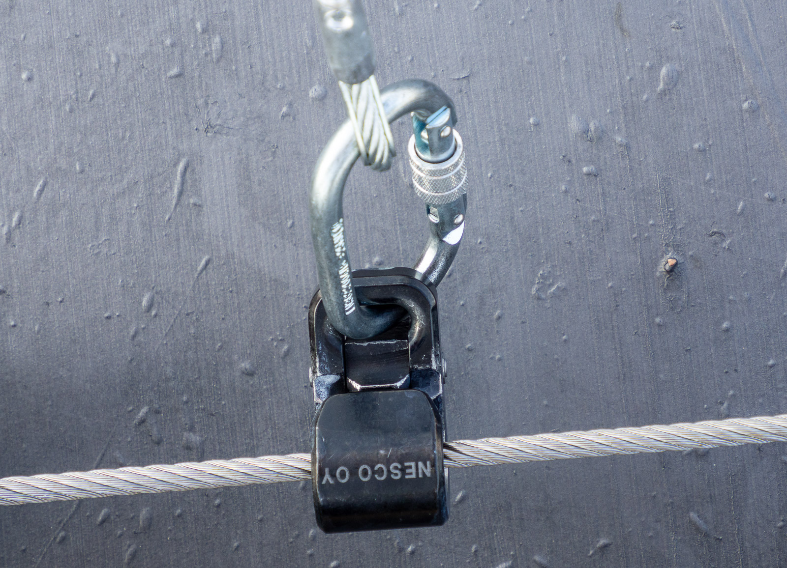 Pujottauduimme oransseihin valjaisiin ja pääsimme pian harjoittelemaan kiinnitysvaijerin ulkoiluttamista. Ohje oli, että talutat sitä kuin koiraa, niin kyllä se siitä. Haasteenahan on siis, että seinän vierustaa kulkevan vaijerin kiinnityskohdissa kiinnitysvaijeria joutuu vähän nykimään, ettei eteneminen pysähdy siihen. Mutta opimme tämänkin.