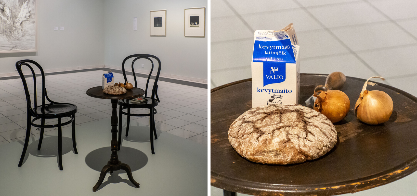 Maitotölkki, ruisleipä ja sipuli muodostavat helpommin ymmärrettävän asetelman, ainakin näennäisesti. Tosin kyse ei ole teoksesta tai varsinaisesta asetelmasta vaan pöytäryhmä tuoleineen on vain rekvisiittaa ympäröiville Pentti Kaskipuron töille. Autenttisia esineitä Pentti Kaskipuron kotoa, jotka päätyivät Sara Hildénin museolle kuten Kaskipuron teoksistakin iso osa.