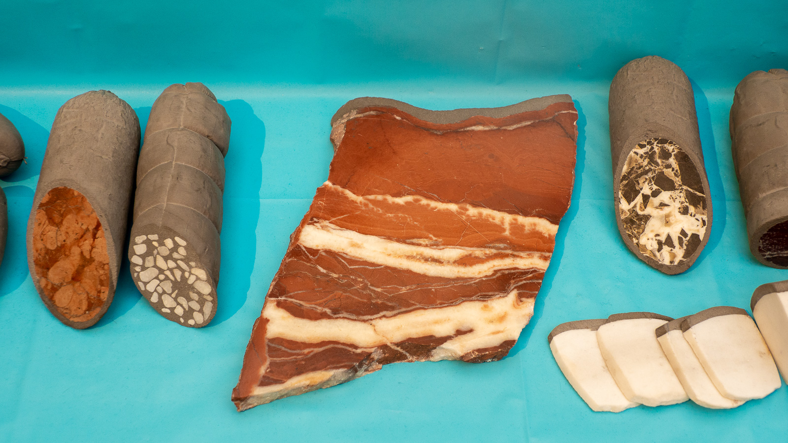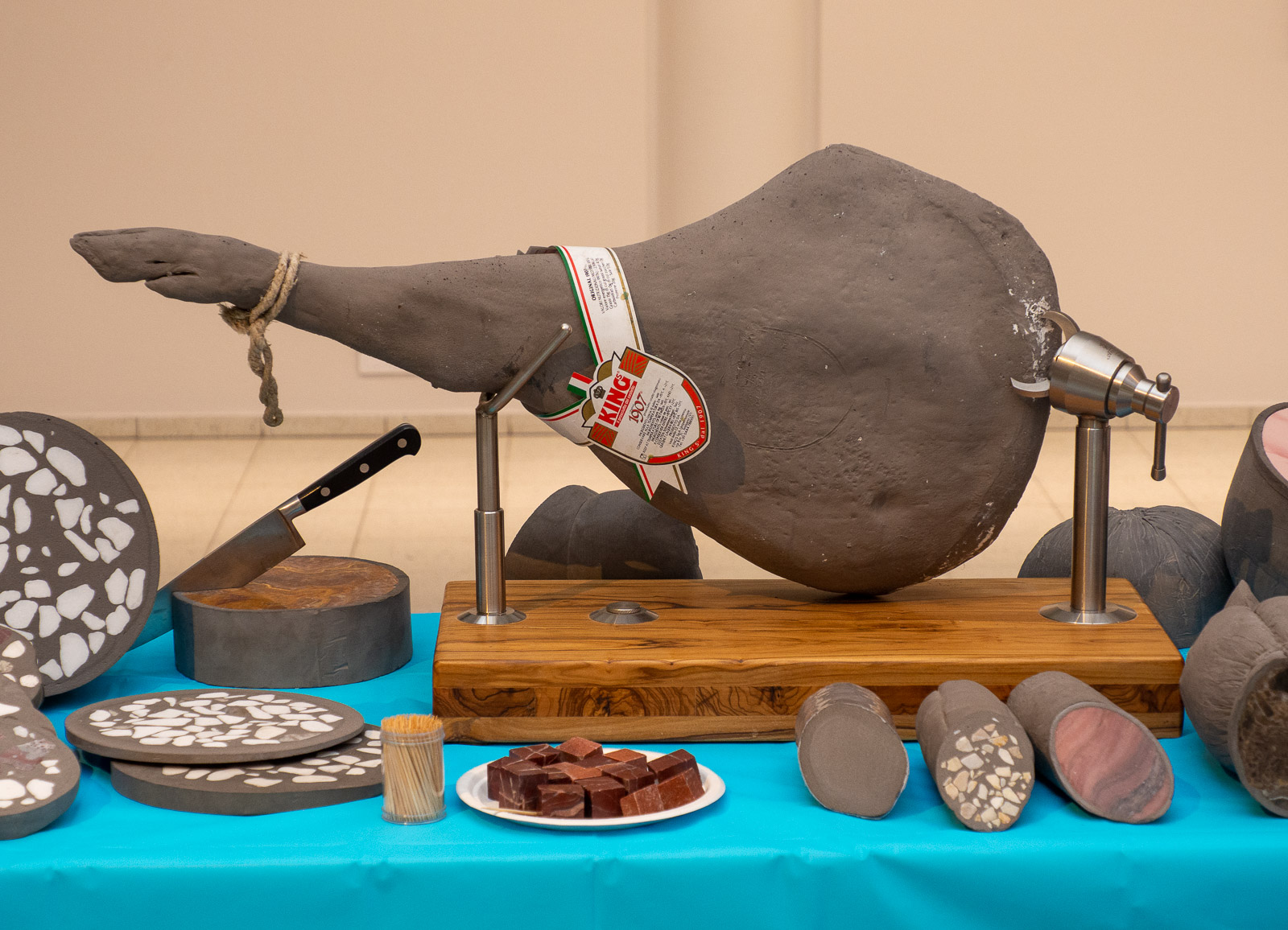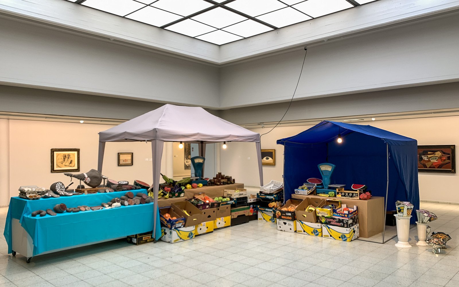 Museon aulassa on pienet markkinat. Tarjolla on kukkia ja hedelmiä, mutta myös lihatuotteita. Yleisnäkymä torille on hiukan viiskytlukulainen, mutta värikäs, jopa jollain tavalla kodikas. Lihatiskin kohdalla realistinen toteutus muuttuu luotaantyöntäväksi: ehken nyt aitoakaan lihatiskiä välttämättä pitäisi kauniina, mutta kivisenä toteutuksena turhankin realistinen liha on liian outoa!