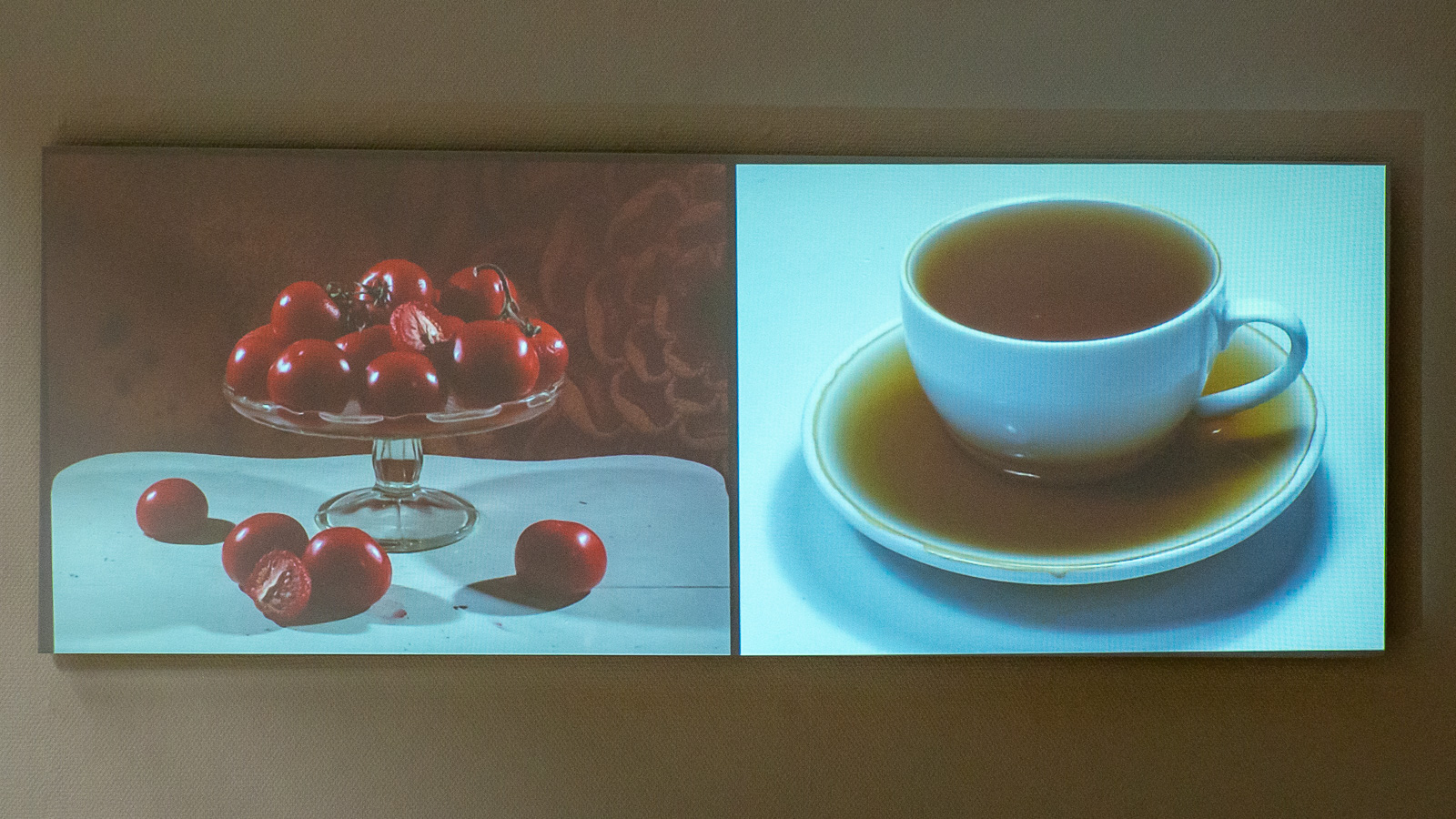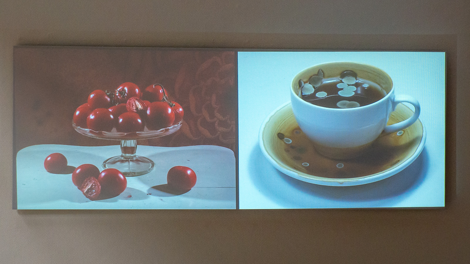 Saara Ekströmin videossa tomaatit ja kuppi kahvia pahenevat, mätänevät, homehtuvat. Jotain inhottavaa tässäkin teoksessa on. Taiteilija haluaa muistuttaa, että ihminen on osa luonnon kiertokulkua kuten vaikka nämä tomaatit. En pääse ihan kiinni tähän ajatukseen, mutta huomaan kyllä ajattelevani, että voisinkohan jättää johonkin kohtaan kotiani jonkun hedelmän viikoiksi, kuukausiksi ja kuvata sen pahenemista päivittäin?