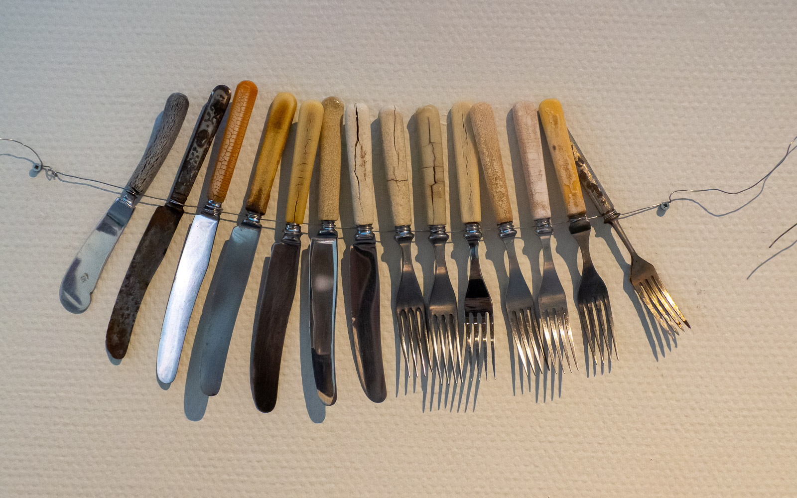 Anu Tuomisen Nälkämaa -sarjan teokset ihastuttavat kekseliäisyydellään ja pakottavat katsomaan niitä lähempää. Juuri tällaisia veitsiä ja haarukoita oli lapsuudenkodissani. Syntyikö idea teoksesta ensin vai keräsikö taiteilija vanhoja aterimia kirpputoreilta ensin ilman selkeää ajatusta niiden käytöstä?