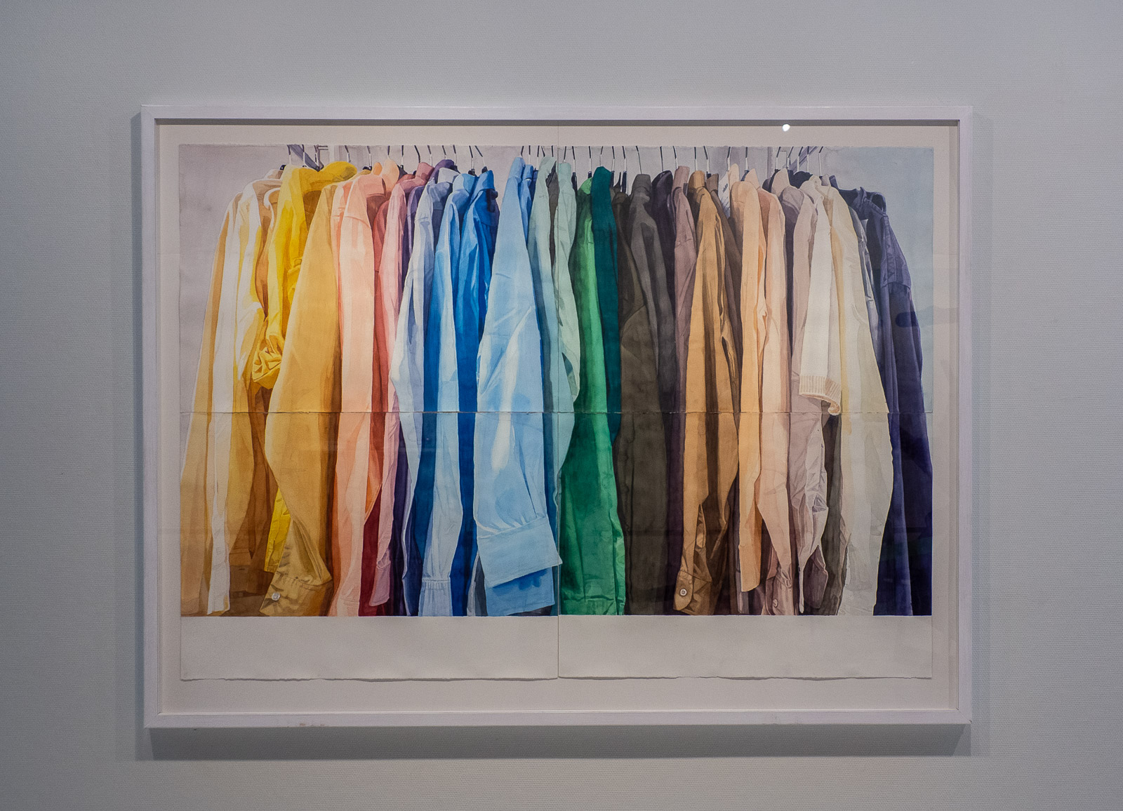 Arto Korhosen Kirjo-työssä on kaunis spektri erivärisiä paitoja akvarellina toteutettuna. Tältä vaatehuoneen pitäisi näyttää! Tai jos olisi oikein iso vaatehuone, niin tämä teos olisi upea sen jollain seinällä.