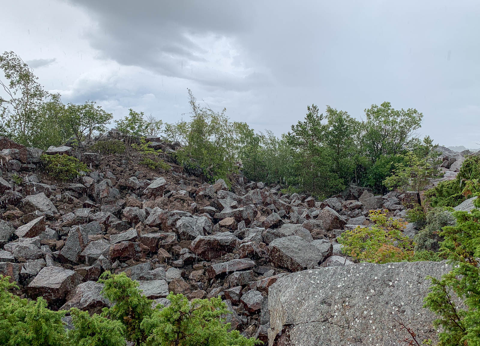 Kohta näemme jo mertakin, mutta jatkamme matkaa, tarkoituksena poiketa niemen kärjessä sijaitsevalla lintutornilla asti, mutta hetken päästä kesäsade muuttaa suunnitelmamme. Ensin pari pisaraa, mutta kohta sataa jo kaatamalla. Ehdimme louhikolle asti. Tästä polku olisi kääntynyt alas oikealle lintutornille, mutta sateen takia hakeuduimme lähimmän vähänkin isomman puun suojaan ja päätimme kääntyä takaisin: merelle tuskin olisi nähnyt eikä märkään lintutorniin kiipeäminenkään houkutellut. Tuskin merikotkatkaan lentelevät sateella.