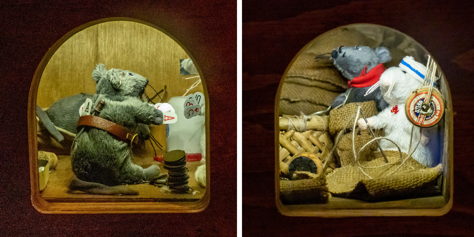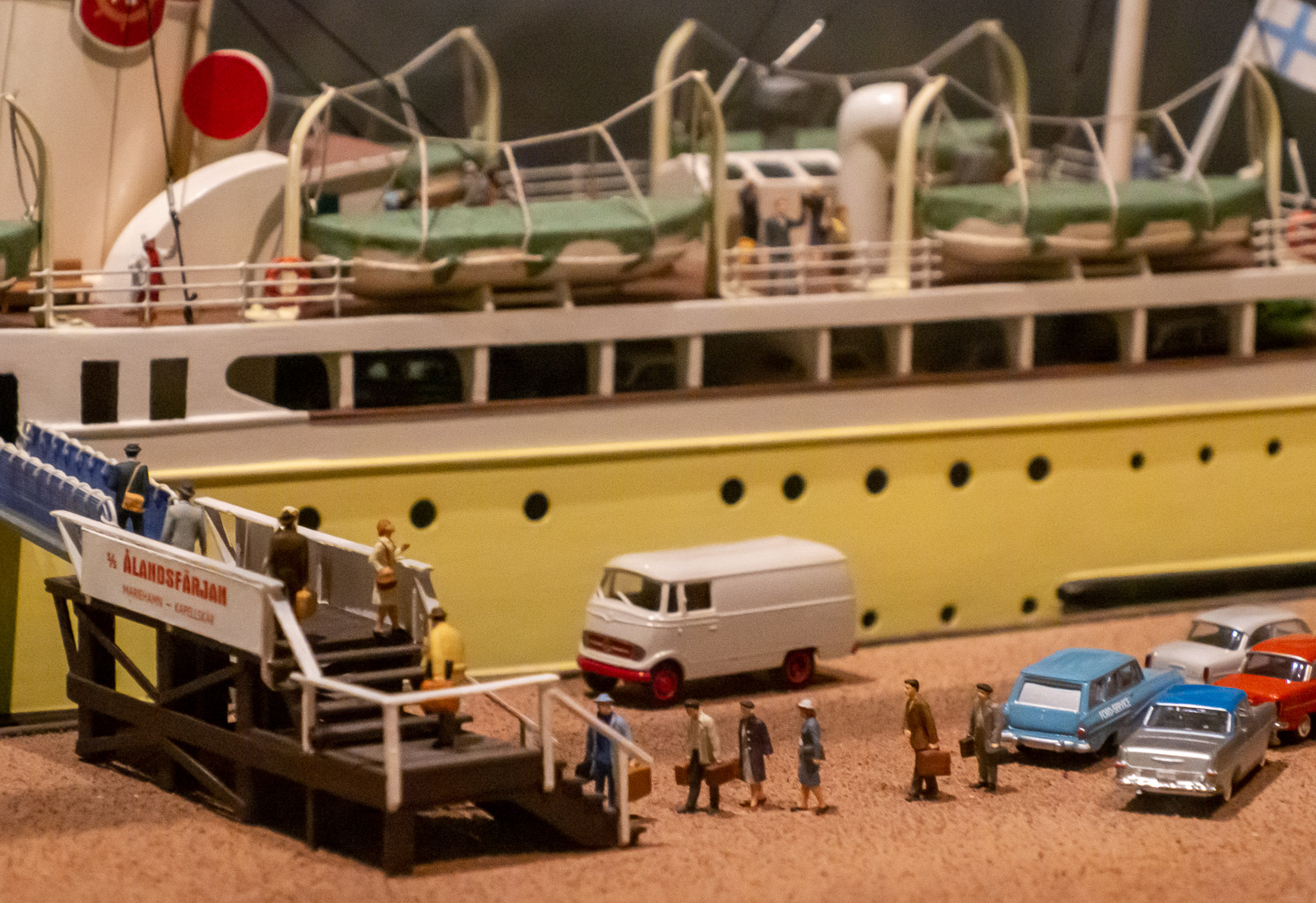 Tällä kertaa etsimme, niin senioreita kuin olemmekin, muun tutustumisen lomassa Ruby laivarottia – ja löytyiväthän ne, kaikki viisi, lattianrajassa sijaitsevista koloistaan. Tällä kertaa huomioni kiinnittyi myös Ålandsfärjanin pienoismalliin, johon oli toteutettu myös matkustajat, niin jalkaisin kuin autolla laivaan saapuvat.