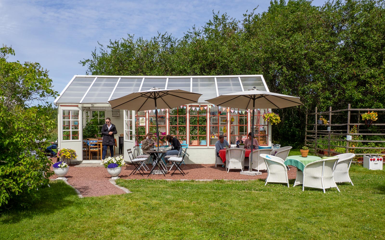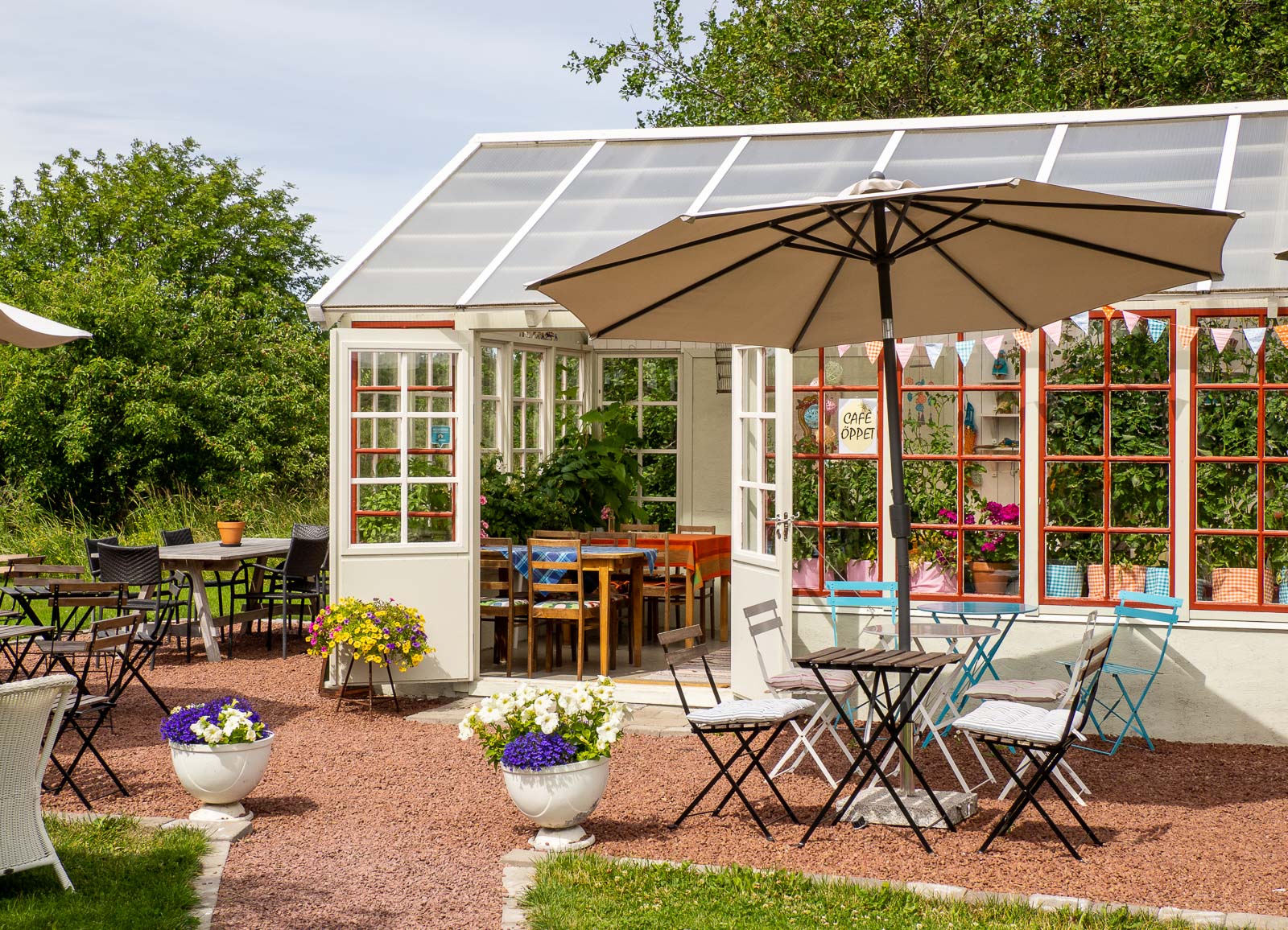Ahvenanmaan must-juttuja joka kerta siellä käydessämme on Ahvenanmaan pannukakku. Tällä kertaa Humlanin kahvila vaikutti etukäteistutkimuksen perusteella hyvältä paikalta nauttia siitä ja sitä se olikin. Kesäisen vihreässä pihapiirissä on pieneen valkoiseen kasvihuoneeseen toteuttu kahvila, jonka pöydät leviävät nurmikon reunoille asti. Ålandspannkaka med sviskonkräm och grädde, juuri oikeanlaisena. Maarianhaminan keskustan kahviloissa perinteinen pannukakku on joskus jalostunut melko hienostuneeksikin leivosmaiseksi annokseksi, mutta täällä se on yksinkertaisesti pannukakkua, hilloa ja kermavaahtoa.