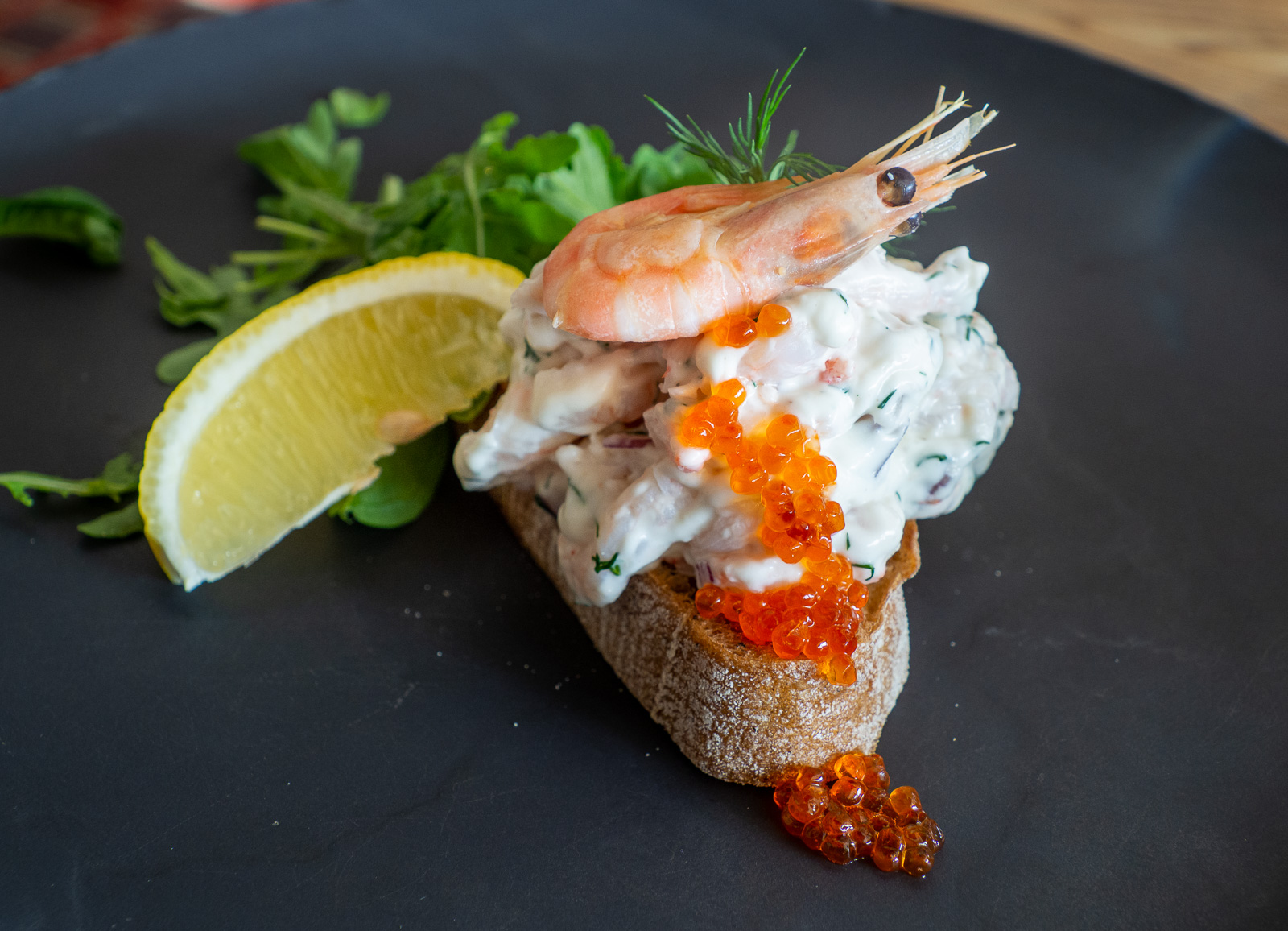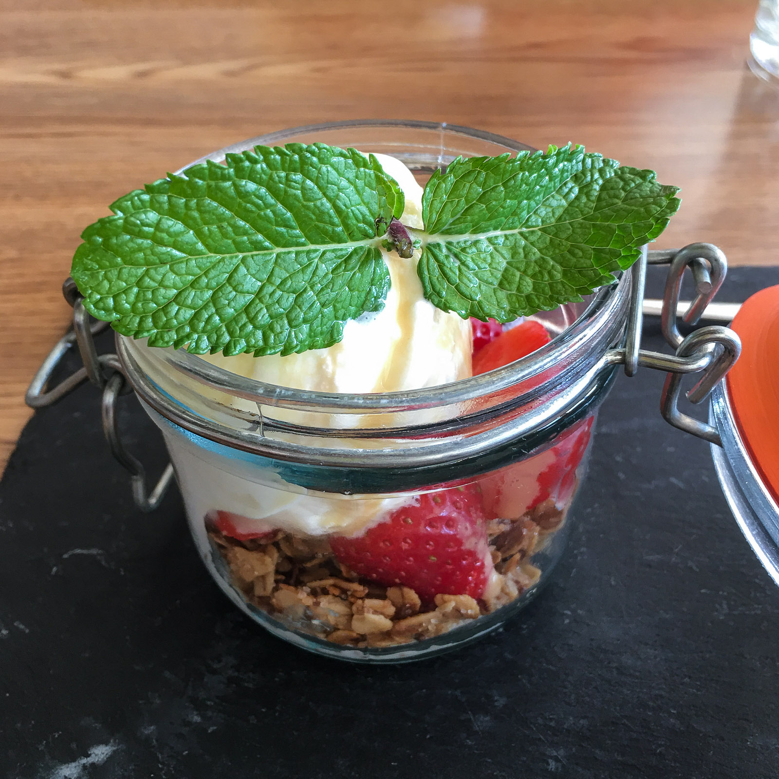 Ravintolassa usein kumpikin meistä valitsee lempiruokiaan, joita siltä osin kuin ne eivät ole samoja, valmistamme kotona harvemmin. Tällä logiikalla päädyimme ankanfileeseen kauden uunikasviksilla ja kirsikkakastikkeella ja alkuruokalistalta löytyneeseen Toast Skageniin. Ankka oli mehukasta, mutta alkuruokakokoinen Toast Skagenista ei nyt tietysti ihan ollut kokonaiseksi ateriaksi. Lasse paikkasi asiaa paitsi ankan mukana tulleilla maalaisranskalaisilla myös juustolautasella siinä missä Pirkolle riitti mansikka-trifle kinuskikastikkeella, kauracrumblella ja vaniljajäätelöllä.