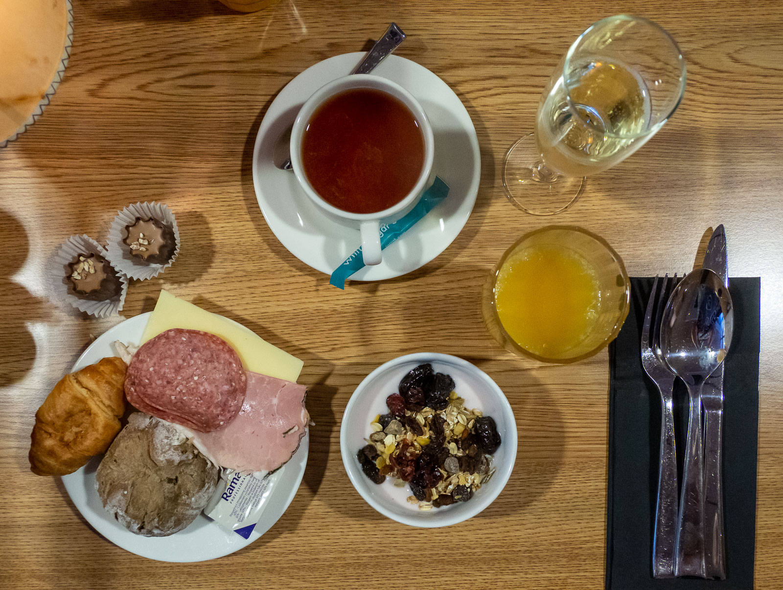 Buffet-aamiaisen valikoima oli riittävä – eiköhän sieltä jokainen löytänyt omansa ja vähän enemmänkin, juomia myöten. Kahvikoneelta näytti löytyvän aika monta erikoiskahvivaihtoehtoa, mutta teenjuojalta ne jäivät testaamatta.