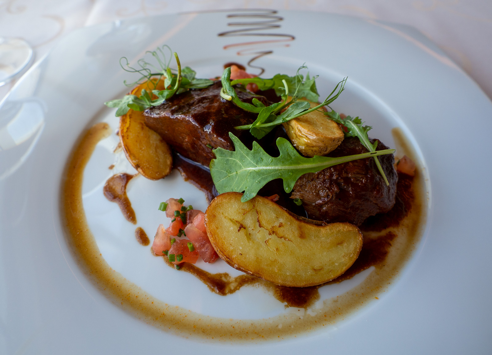 Toisen illan ravintolavalintamme oli vaihtelun vuoksi Gourmet Baltic Queen, mutta jos olisimme viipyneet laivalla vielä kolmannenkin illan, olisimme kyllä palanneet Grill Houseen, jossa tunsimme olevamme enemmän kotonamme. Ei niin, että Gourmet-ravintolassakaan mitään vikaa olisi ollut, päinvastoin, esimerkiksi palvelu vähän myöhemmin illalla oli todella nopeaa ja ystävällistä, mutta suppealla ruokalistalla olleet vaihtoehdot olivat ehkä vähän liiankin hienoja Ahvenanmaan retkipäivän iltaan.