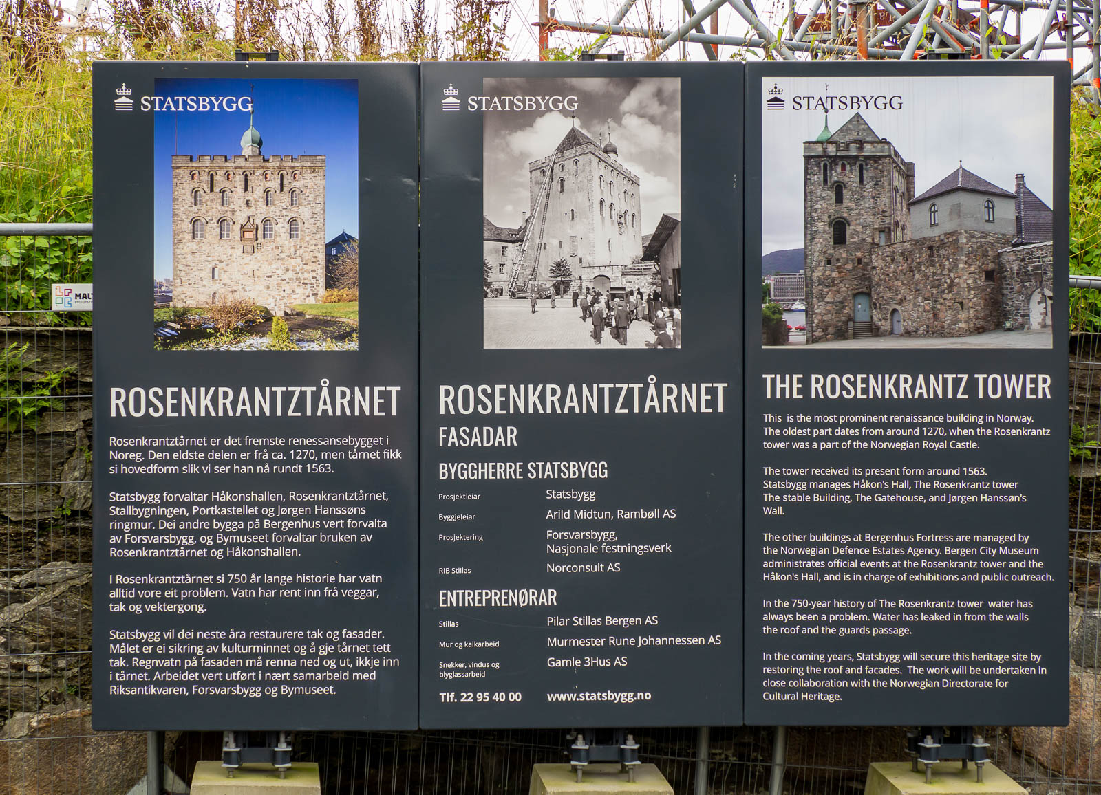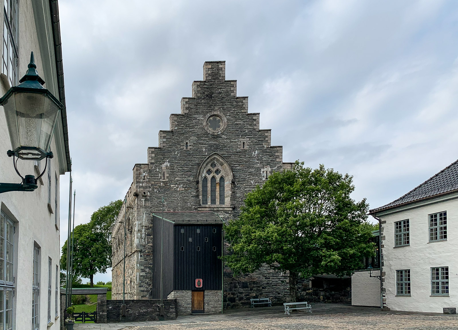 Pienen satama-altaan laidalla sijaitsee myös Bergenhusin linnoitus. Rosenkrantzin torni oli tänä kesänä remontin takia huputettu, mikä vähän ensin latisti intoamme käydä katsastamassa linnoituksen aluetta, mutta kävimme sitten kuitenkin. Linnoituksen puisto on kuitenkin iso ja kaunis ja bunkkerin seiniä pitkin nousevat köynnökset luovat korkeuksiin asti ulottuvan vihreän maiseman. Alueella on myös iso ulkoilmaravintola, joka ainakin näin korona-aikaan vaikutti ihan hyvältä vaihtoehdolta, jos juuri silloin olisimme olleet ruuan tarpeessa.