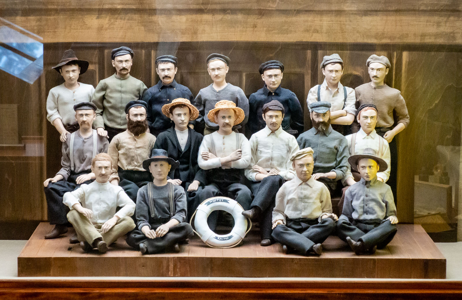 Toinen erityisen mielenkiintoinen kohde museon monen monen kohteen joukossa oli Hoppet-laivan miehistöstä pieninä nukkeina toteutettu “taulu”. Toteutukseen kuuluvalla tabletilla saattoi valita haluamansa miehistön jäsenen ja kuunnella/lukea mitä juuri hän ryhmäkuvaa “otettaessa” oli miettinyt. Yksi miehistön jäsen pohtii kalastusmahdollisuuksia tässä satamassa siinä missä kapteeni pohtii, että mitenkähän saa paluumatkalle tarvittavan miehistön kasaan muutaman karattua tässä(kin?) satamassa.