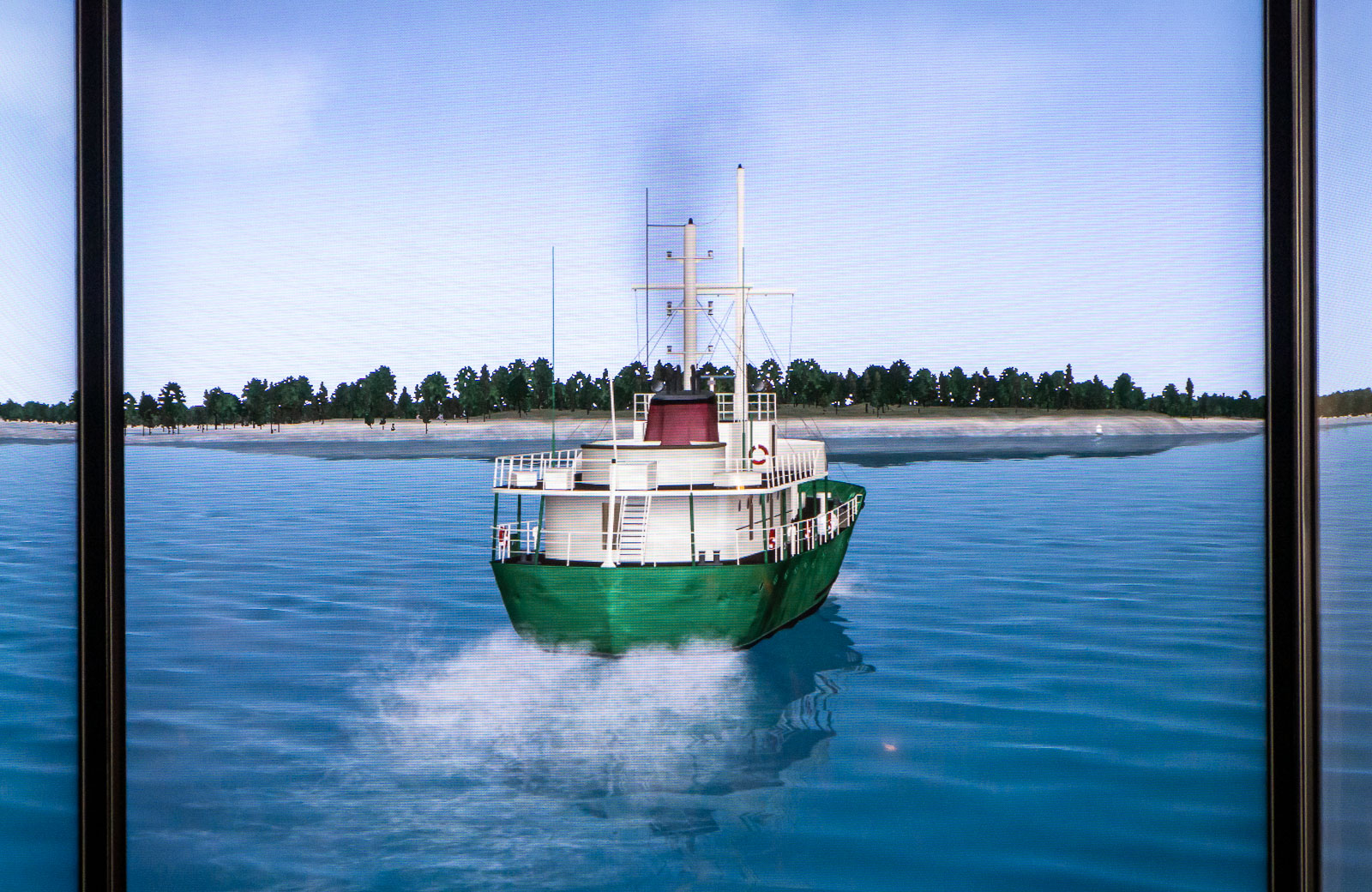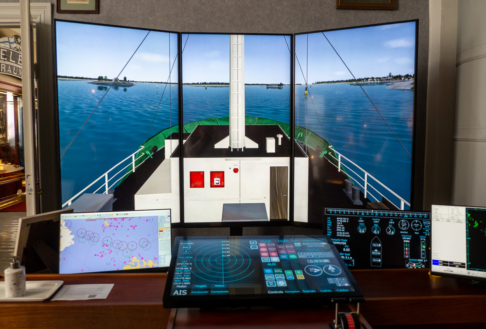 Odottelimme hetken aulassa, että museon kaikkiin tiloihin saatiin valot ja laitteet, kuten vaikka museon ylpeys, navigointisimulaattori, saatiin käyttökuntoon. Luvan saatuamme lähdimme kiertämään museota. Saimme vielä evästyksen, että tulkaa sanomaan, kun saavutte simulaattorin luo, niin käydään yhdessä sitä läpi. JENNY II, navigointisimulaattori, on otettu käyttöön kesällä 2019 ja se edustaa simulaatiokoulutuksen kärkeä ja vastaa ominaisuuksiltaan merenkulun koulutuksessa käytettäviä simulaattoreita. Simulaattorilla voi halutessaan yrittää itse haluamissaan olosuhteissa yrittää vaikka suoriutua autolautalla sitä komentosillalta ohjaten Kustaanmiekasta, mutta nämä yritykset päätyvät kuulemma usein haaksirikkoon, joten valitsimme autopilotin ja seurasimme vain aluksen menoa. Alukseksikin valittiin helpommin käsiteltävä pienempi kalastusalus. Menoa seuratessamme kommentoimme Helsingin edustalla vallitsevaa hienoa, lähes tyyntä säätä, ja pohdimme, että mitenkähän sitten sateella ja myrskyssä. Eipä mennyt kuin hetki, kun Anna oli vaihtanut simulaattorin säätilan haastavammaksi ja pieni laiva keinuikin aalloilla. Autopilotti hoiti kuitenkin homman! Vilkkaimpina kesäpäivinä simulaattorin käyttövuoroa saattaa kuulemma joutua jonottamaan ja käyttövuorojen pituudet ovat rajattuja.