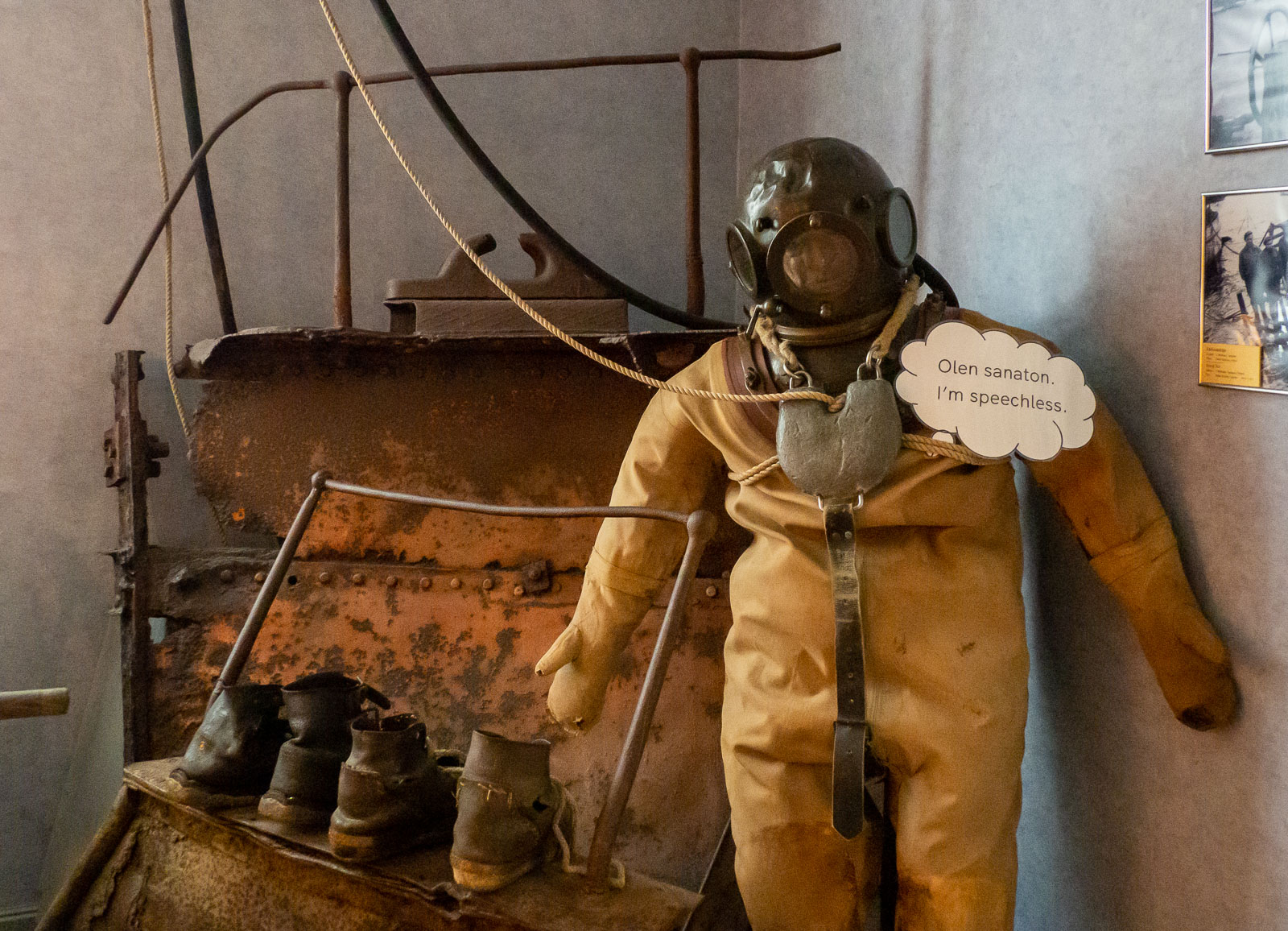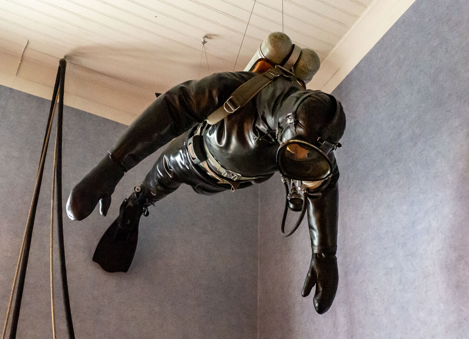 Sukelluspukuja ja muita varusteita esittelevä huone on sekin vaikuttava.