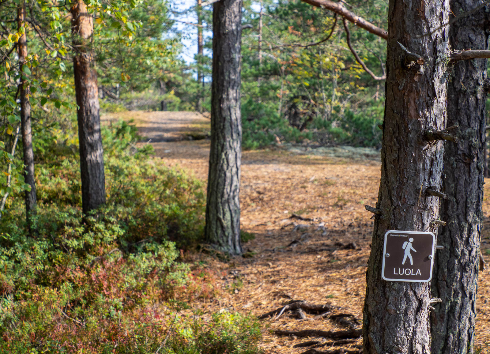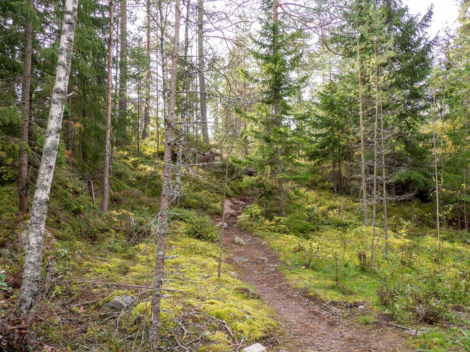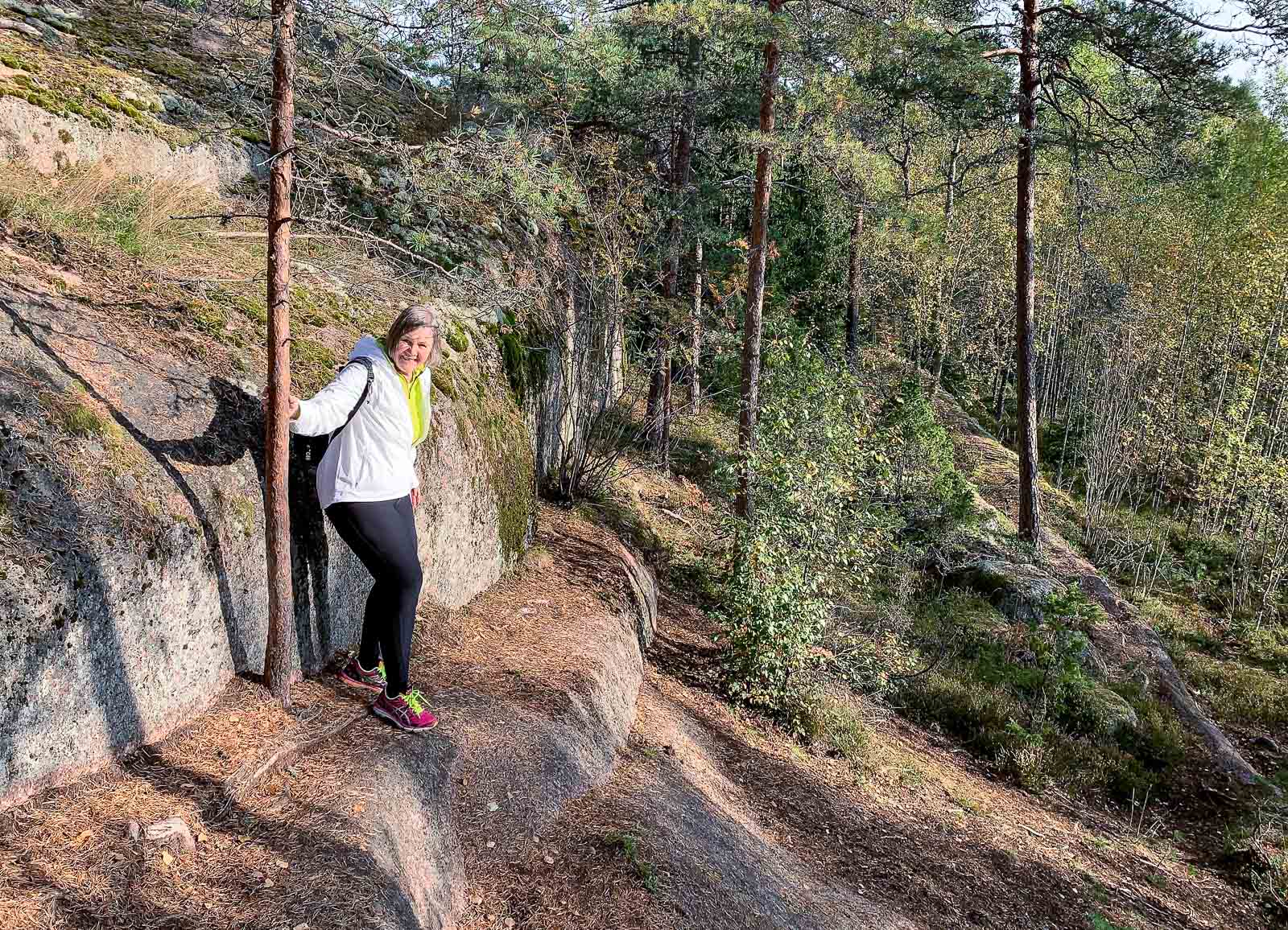 Reitin pituus lienee noin kilometri, sillä vaikka linnuntietä parkkipaikalta luolalle ei ole kuin muutama sata metriä, niin kallioita ei voi ihan suoraan noista ylös ja alas. Polku kierteleekin hiukan suuntaan ja toiseen, mutta mielelläänhän sitä hienossa metsäluonnossa kiertelee.