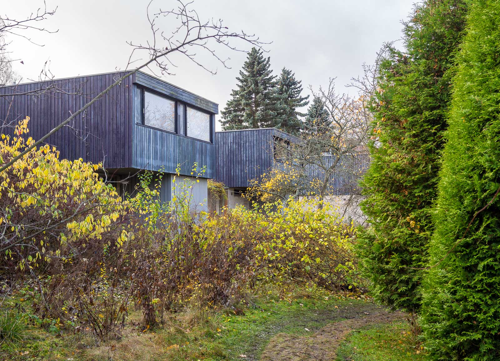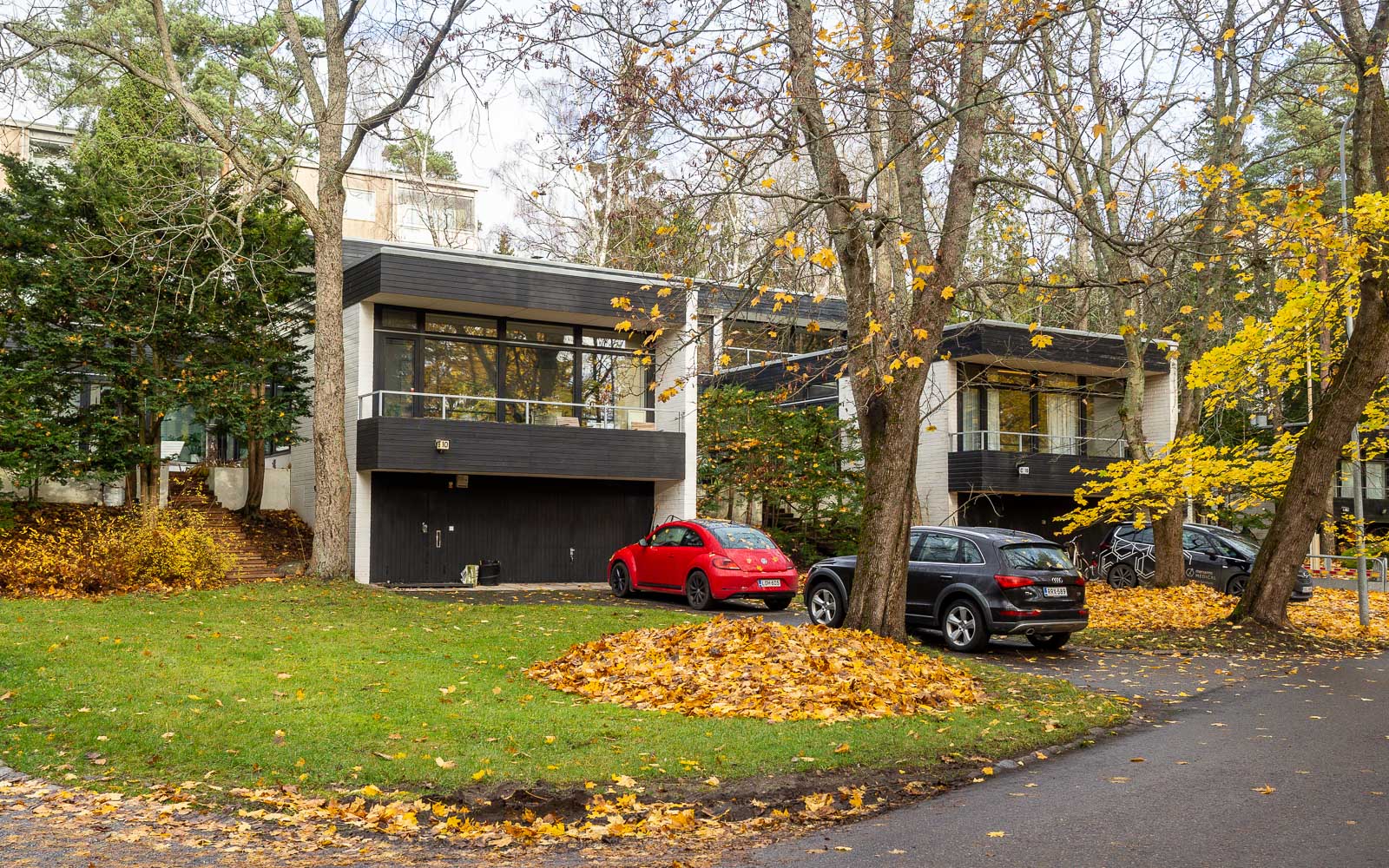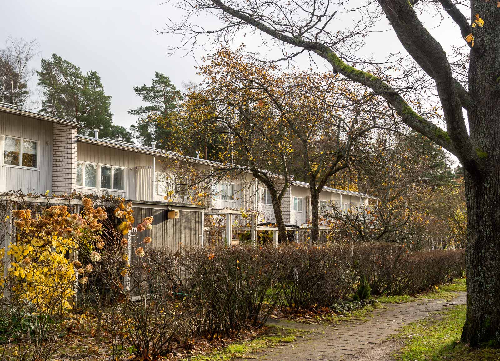 Marraskuisena aamuna lähdimme pienelle kierrokselle. Kävimme katsomassa kaikki pienessä kirjassa Tapiola (Timo Tuomi: Tapiola – Puutarhakaupungin vaiheita, arkkitehtuuriopas) mainitut Kaija ja Heikki Sirenin suunnittelemat asuintalot – ja pari muutakin taloa Pohjantorin alueella. Kirjaa on saatavana näyttelyn ajan Emman myymälässä tai ostettavissa nettiantikvariaateista (kirja on vuodelta 1992).