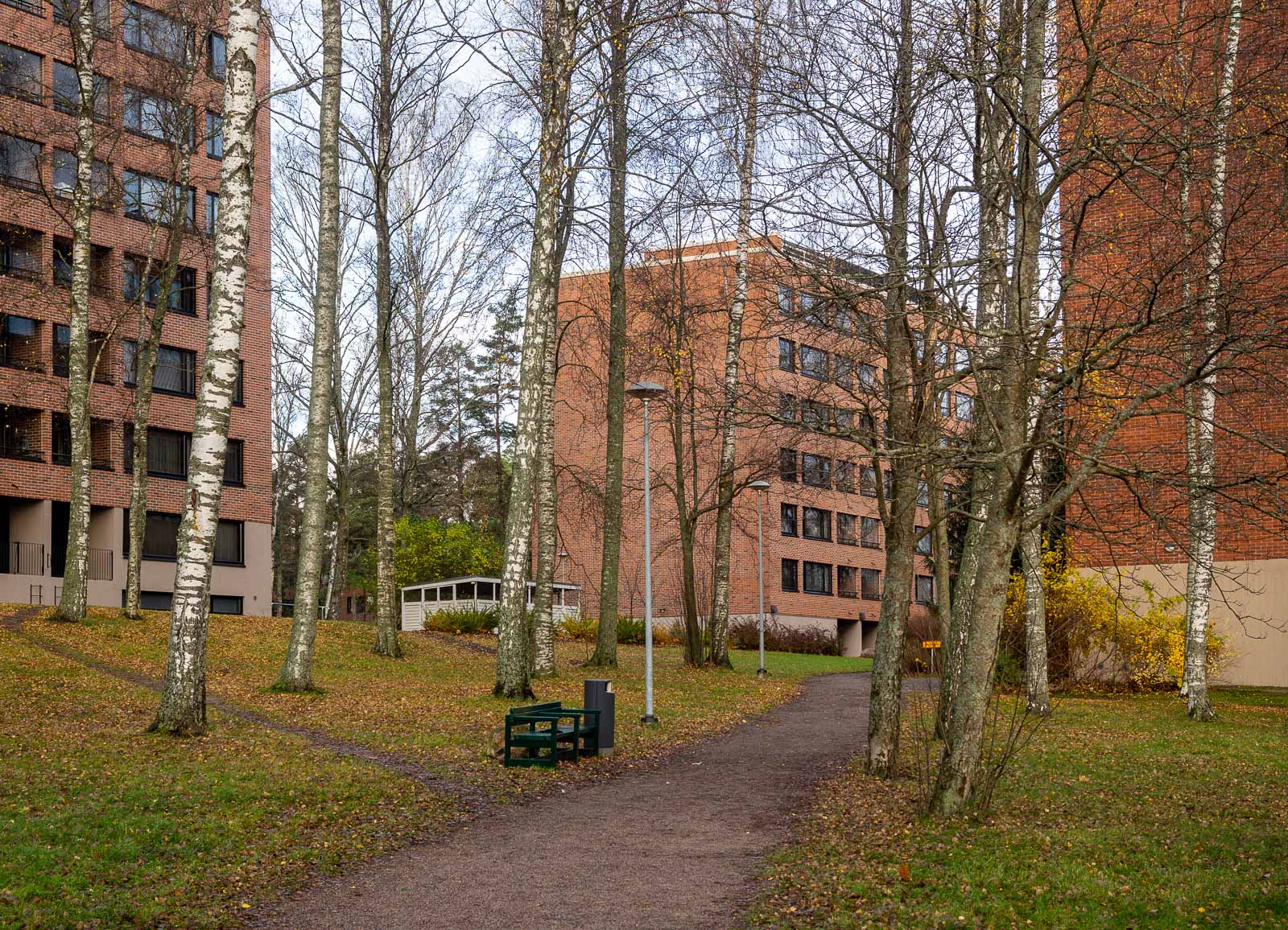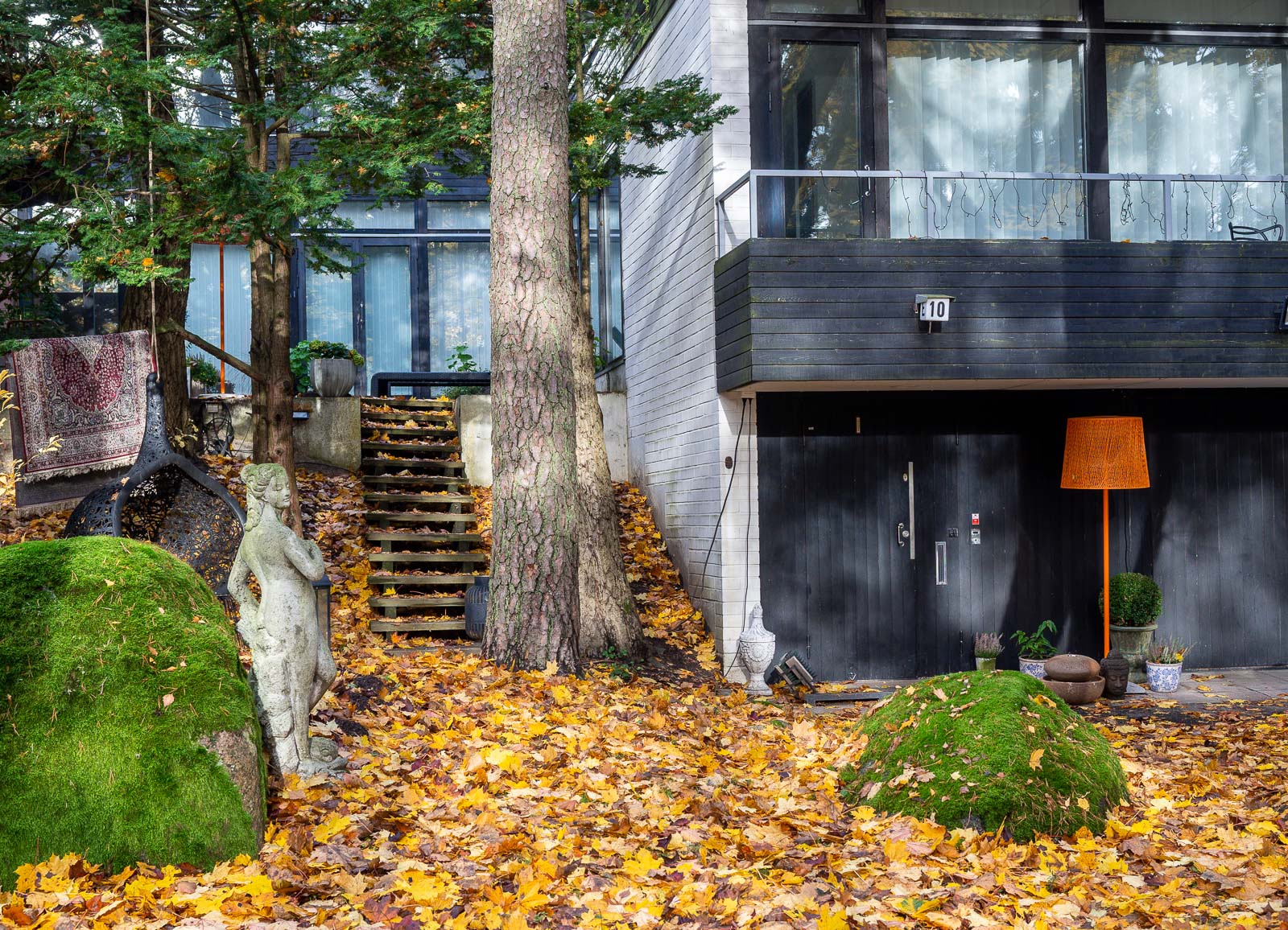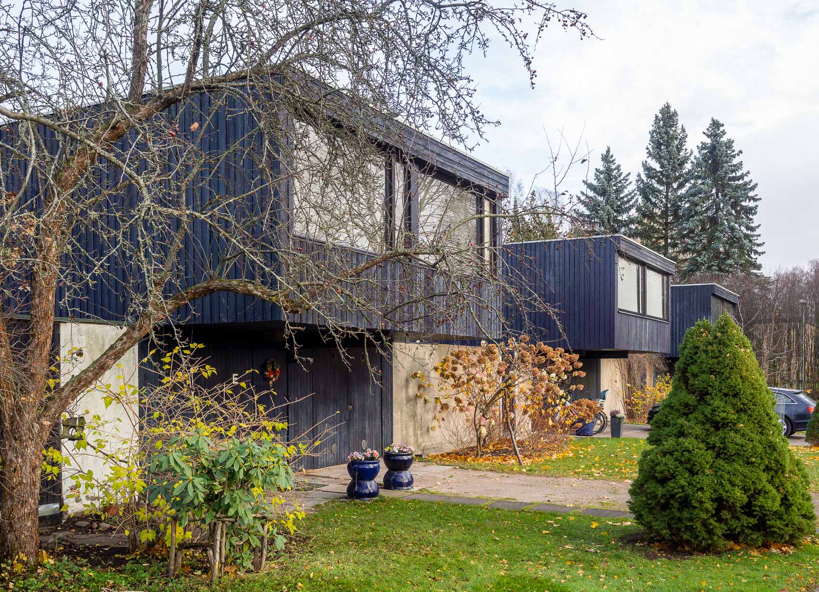 Marraskuisena aamuna lähdimme pienelle kierrokselle. Kävimme katsomassa kaikki pienessä kirjassa Tapiola (Timo Tuomi: Tapiola – Puutarhakaupungin vaiheita, arkkitehtuuriopas) mainitut Kaija ja Heikki Sirenin suunnittelemat asuintalot – ja pari muutakin taloa Pohjantorin alueella. Kirjaa on saatavana näyttelyn ajan Emman myymälässä tai ostettavissa nettiantikvariaateista (kirja on vuodelta 1992).