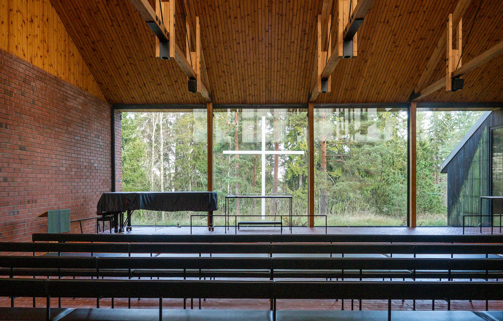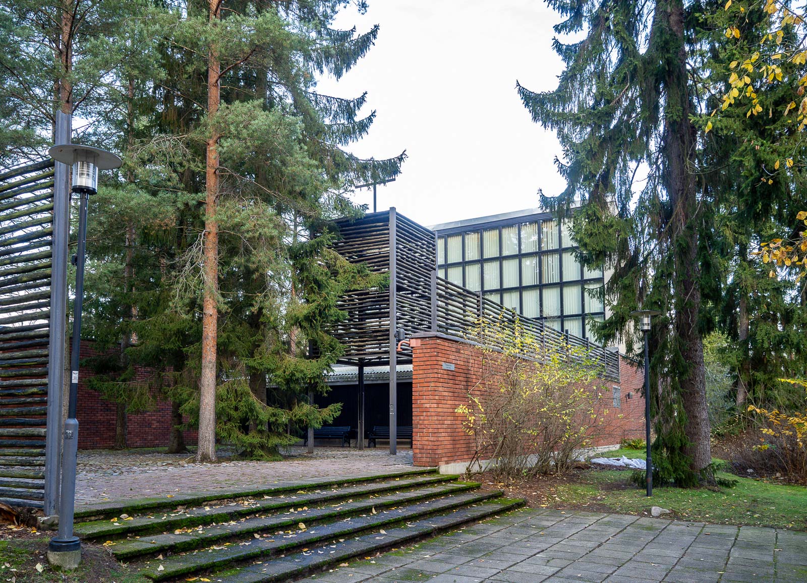 Materiaalit, punainen tiili ja tummaksi petsattu riuku, jota on käytetty myös rajaamaan neliskulmaista kellotornia etupihalla, arkkitehdit poimivat ympäröivän teekkarikylän materiaaleista. Myös teekkarikylä on Sirenien suunnittelema.