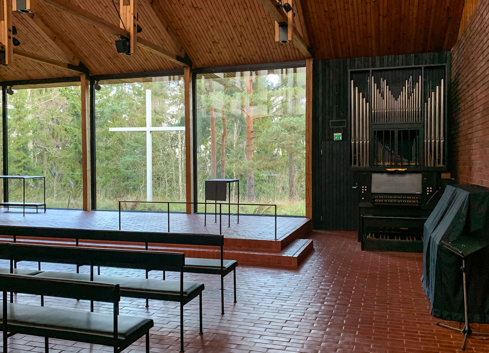 Ok, Otaniemi ei ole Tapiolassa, mutta halusimme samalla kertaa poiketa katsomassa myös KAMUn näyttelyssä paljon esillä olevan Otaniemen kappelin. Kappeli on auki vain toimitusten aikana, mutta meillä kävi hyvä tuuri, sillä osuimme kappelille samaan aikaan, kuin sitä ristiäispaikaksi harkitseva nuoripari, joka oli sopinut tapaamisen vahtimestarin kanssa.