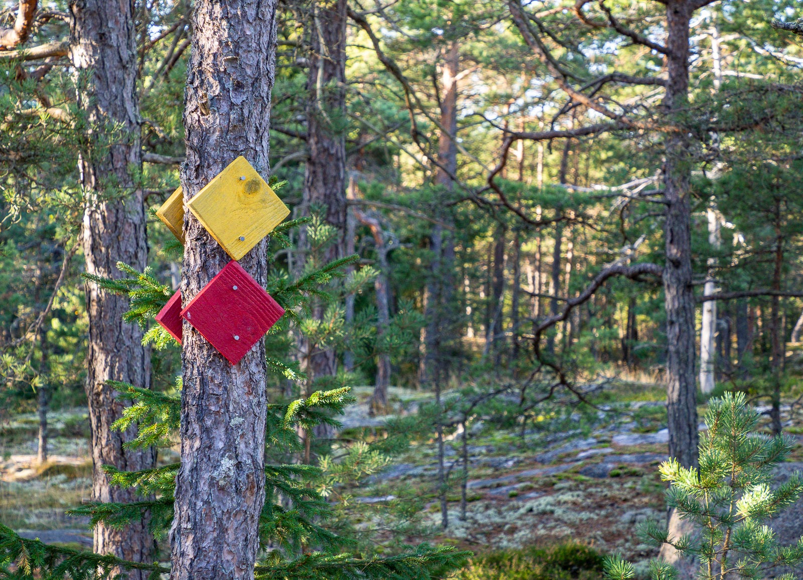Pampskatanin pisto liittyy Telebergetin lenkkiin ja risteyskohtaan palattuamme vaihdoimmekin Pampskatanin punaiset vinoneliöt Telebergetin keltaisiin. Nimensä mukaisesti Telebergetin kierros kulkee enimmäkseen kallioilla, mikä tekee polusta hiukan haastavamman niin seurata kuin kulkea. Kallioilla polusta ei muodostu näkyvää jälkeä, joten reitti ei ole samalla lailla itsestään selvä kuin metsässä kuljettaessa näillä suosituilla monen ulkoilijan tallaamilla poluilla. Vähitellen opimmekin, muutaman kerran hiukan väärään suuntaan jo kuljettuamme, että kyllä niitä keltaisia merkkejä on niin taajaan, että merkiltä näkee seuraavan, kunhan vaan tarkkaan katsoo, eli kovin kauas ei kannata lähteä seuraavaa merkkiä etsimään.