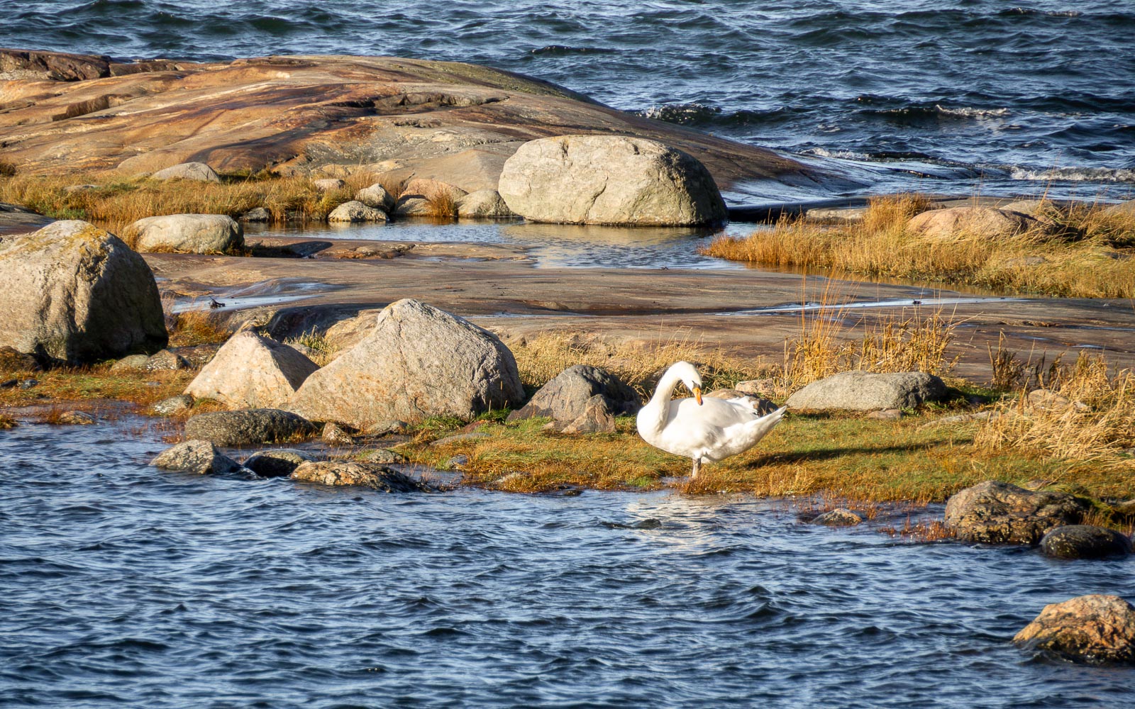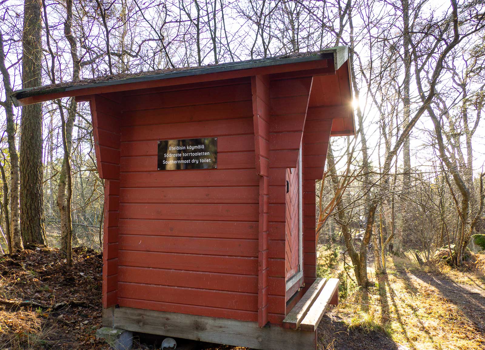Pampskatanin pisto oli koko matkalta melko helppokulkuinen, jossakin kohtaa marraskuinen metsä oli hiukan mutainen ja paikoitellen sai asetella vaelluskenkänsä tarkkaan puiden juurien väliin, mutta mitään kovin haasteellista kohtaa ei mieleeni polulla jäänyt. Polun puolessa välissä ohitimme Merikotkan taukopaikan, jossa arvaukseni mukaan pieni porukka piti ehkä työpalaveria, ja jatkoimme eteenpäin. Pienen lahden kohdalla ihailimme hetken joutsenia, jotka eivät ainakaan vielä olleet päättäneet lähteä marraskuuta ja talvea pakoon, mutta jatkoimme eteenpäin. Ihan Pampskatanin kärjessä polku muuttuikin jo haastavammaksi: hiukan märillä ja jyrkillä kallioilla tuli kenkien pitävyys testattua. Vähän samaan tapaan kuin Hangossa Suomen eteläisin luontopolku oli helppo viimeisille rantakallioille asti. Hetken muuten nauratti niemellä olevan puuceen seinässä oleva kyltti, joka väitti sen olevan eteläisin käymälä. Luultavasti ei nyt ihan Suomen eteläisin vaan tämän eteläisin tämän polun varrella olevista, mutta silti! Pampskatanin kärjen kallioilla pysähdyimme hetkeksi kuuntelemaan merta ympärillämme. Tällaisella niemellä meriluonto on kyllä vaikuttava näky!