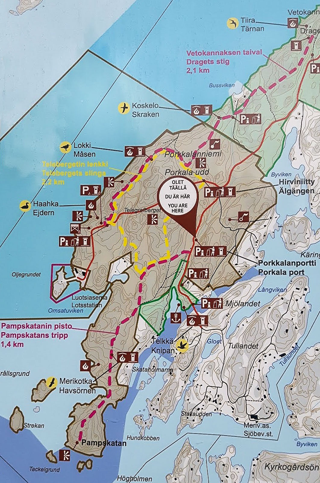 Myös luontopolkuja on kolme: Vetokannaksen taival (2,1 km), Telebergetin lenkki (2,2 km) ja Pampskatanin pisto (2,8 km edestakaisin). Telebergetin lenkki ja Pampskatanin pisto tuntui meille sopivalta yhdistelmältä, joten valitsimme Porkkalan portin. Yhtä hyvin olisimme voineet valita Hirviniityn, mutta halusimme aloittaa Porkkalanniemen eteläkärjestä, eli Pampskatanilta.