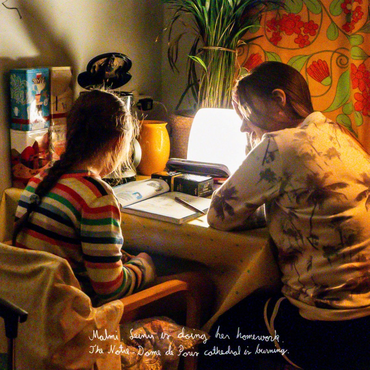 Malmi. Leinu is doing her homework. The Notre-Dome de Paris cathedral is burning.