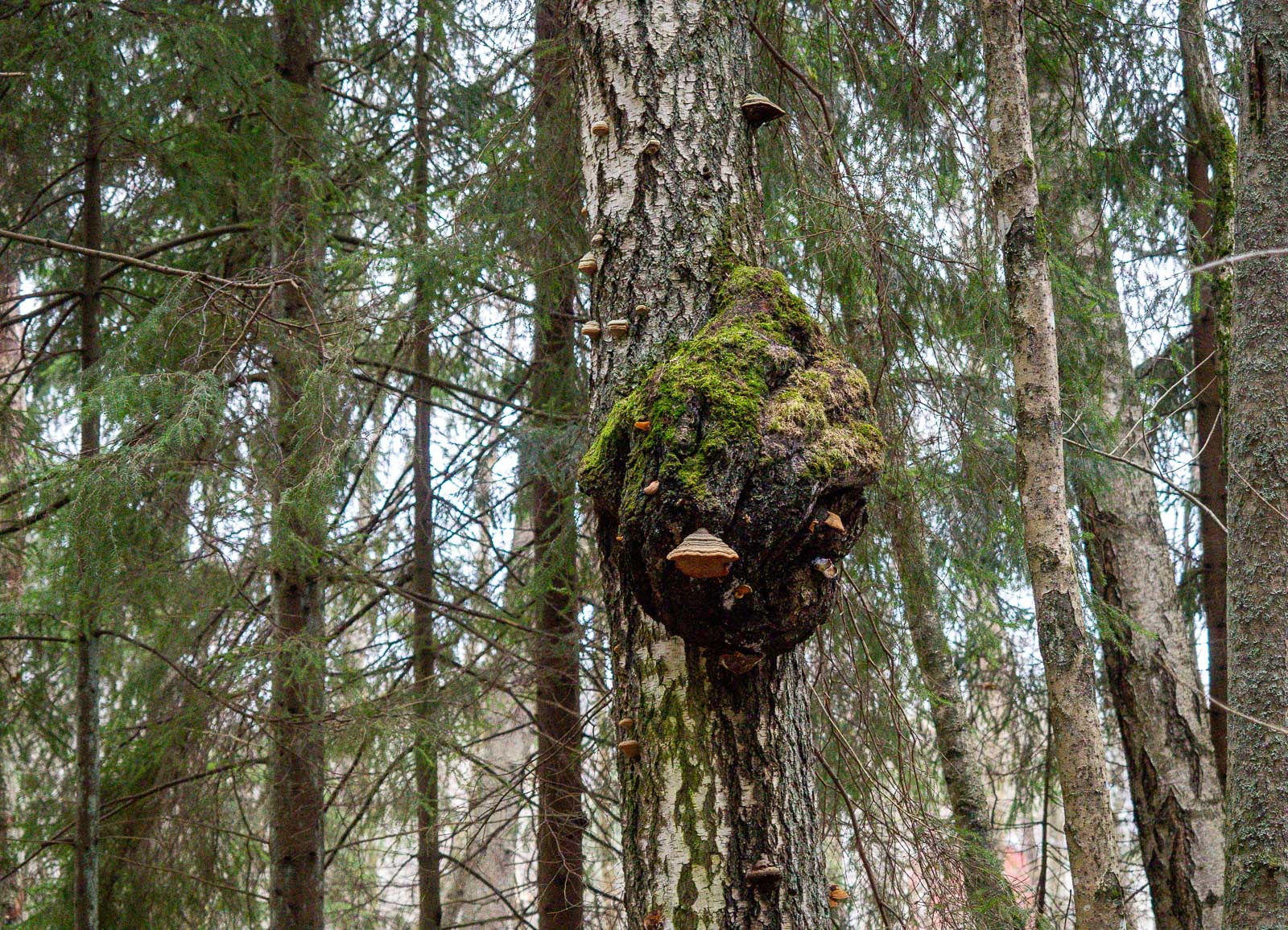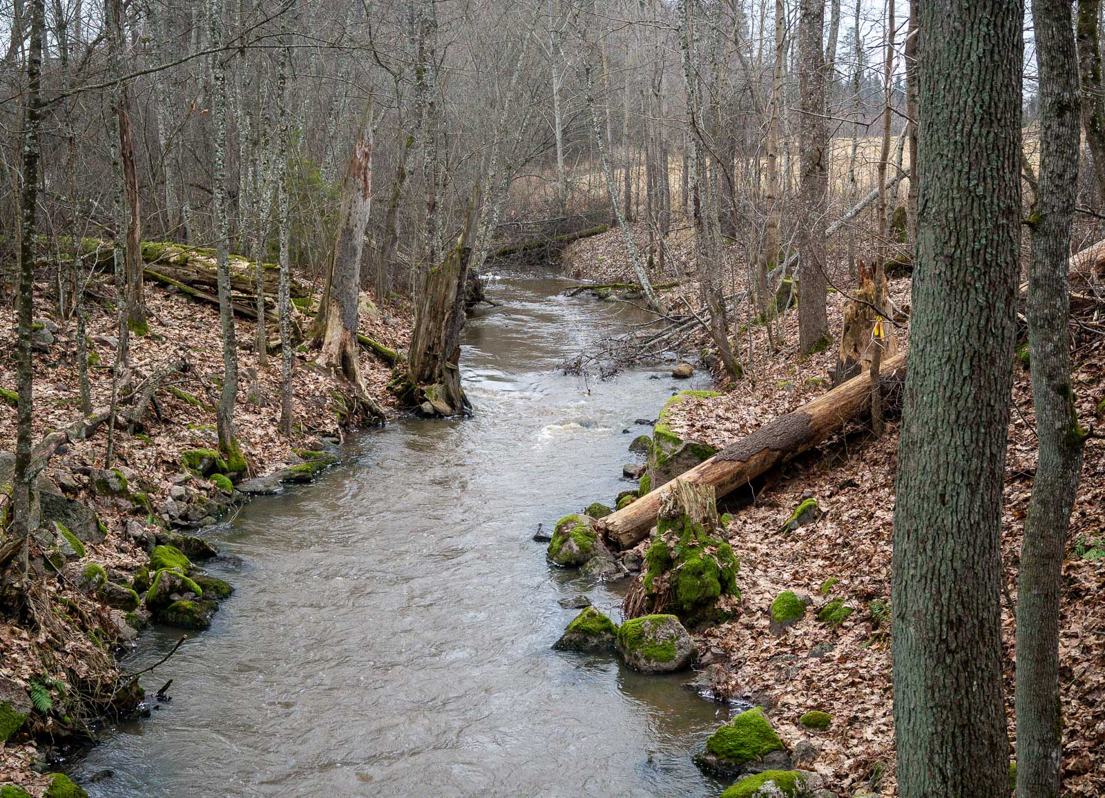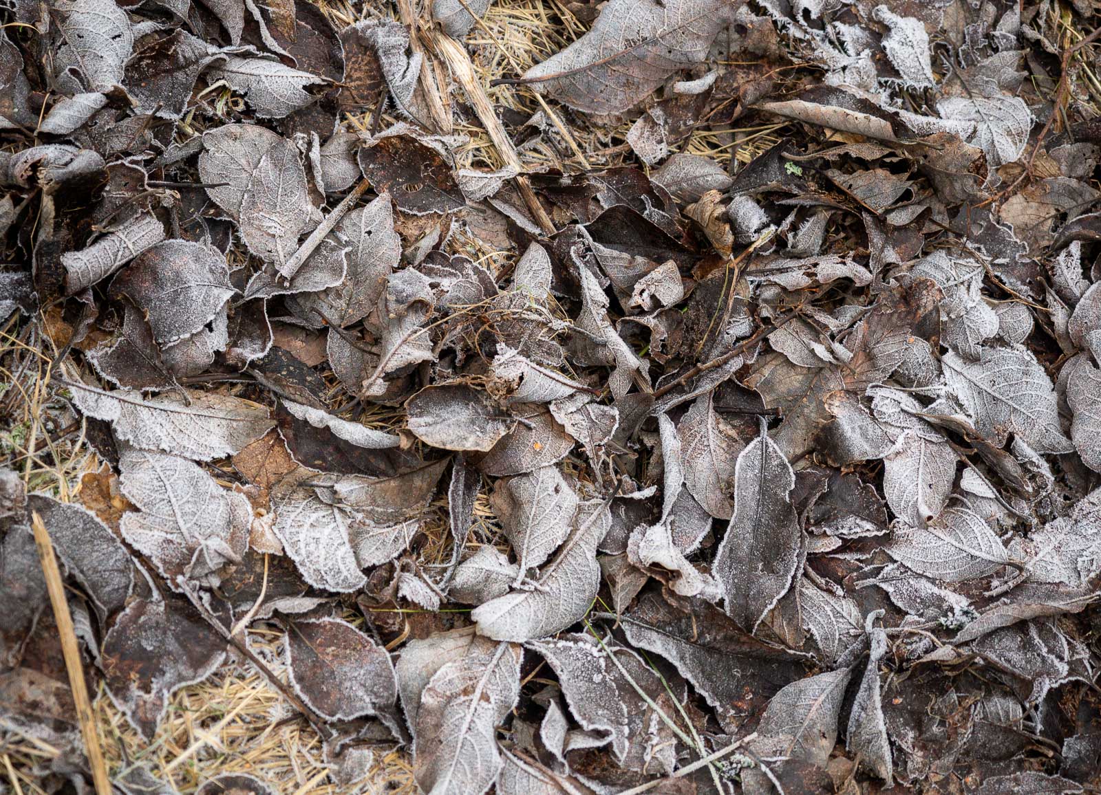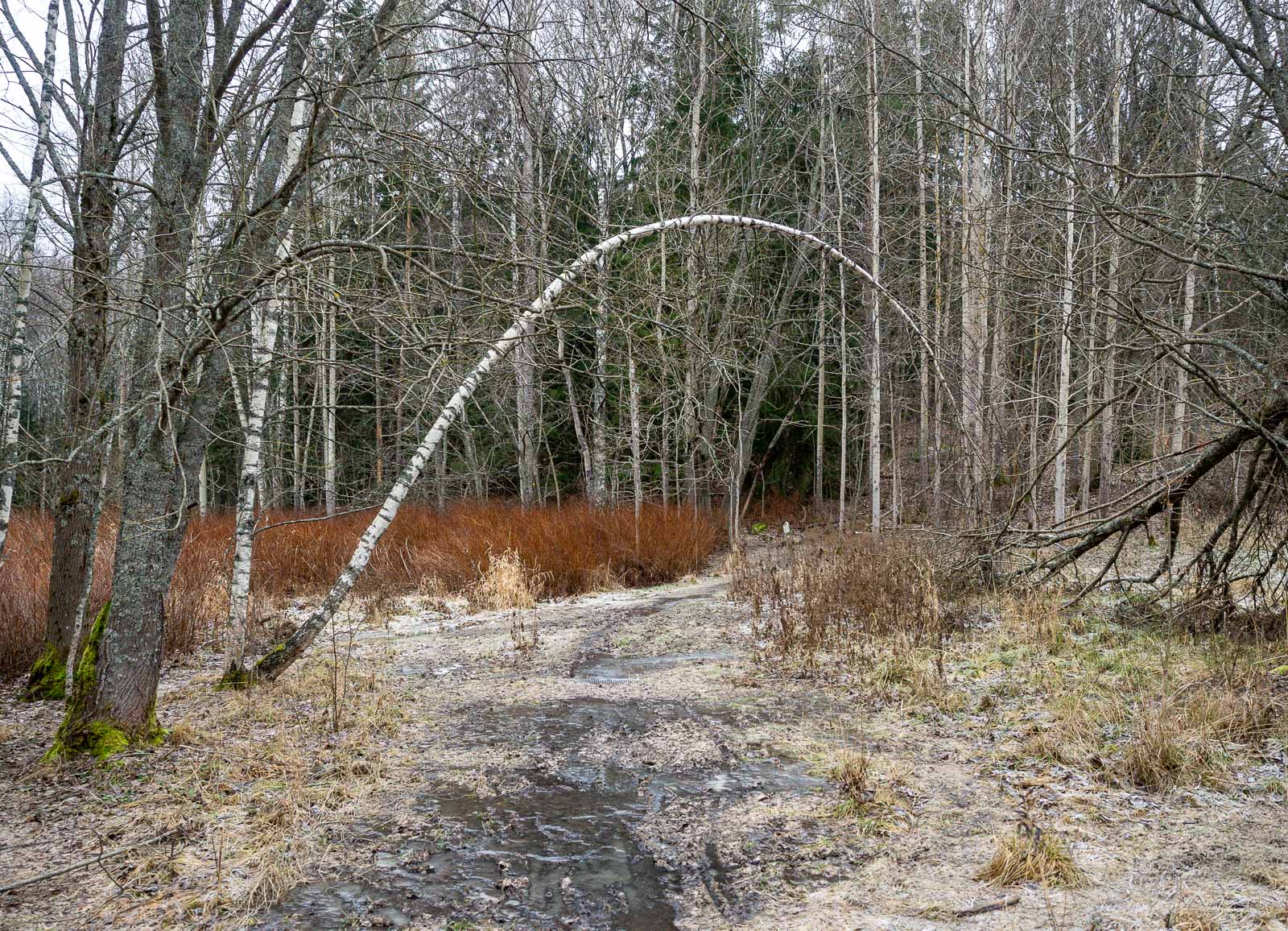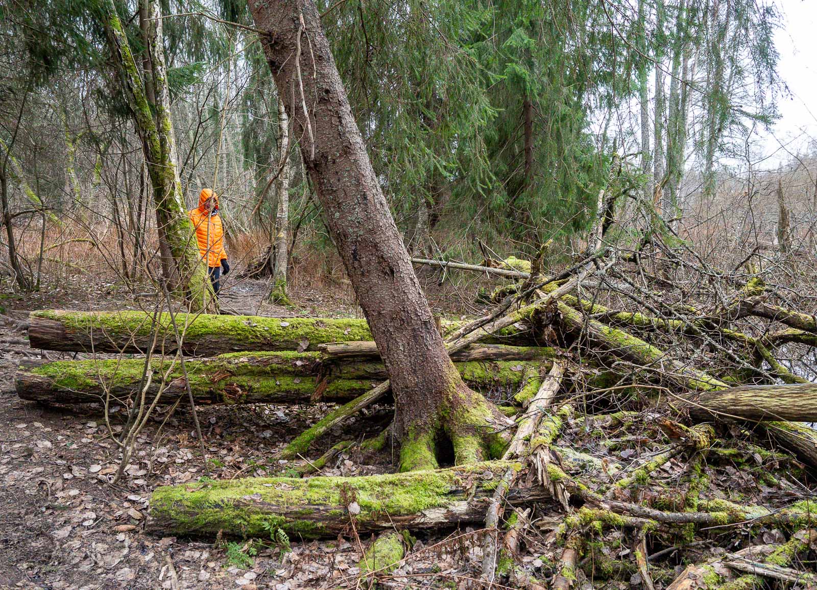Joulukuussa luonto on enimmäkseen väritöntä, mitä nyt monet paikalleen jätetyt kaatuneet tai kaadetut sammaloituneet puut tuovat harmaan keskelle vihreää väriä. Pieni pakkanen on oikeastaan hyvä idea, sillä sulalla säällä, ainakin näin talvella, polku olisikin ollut liian mutainen käveltäväksi.