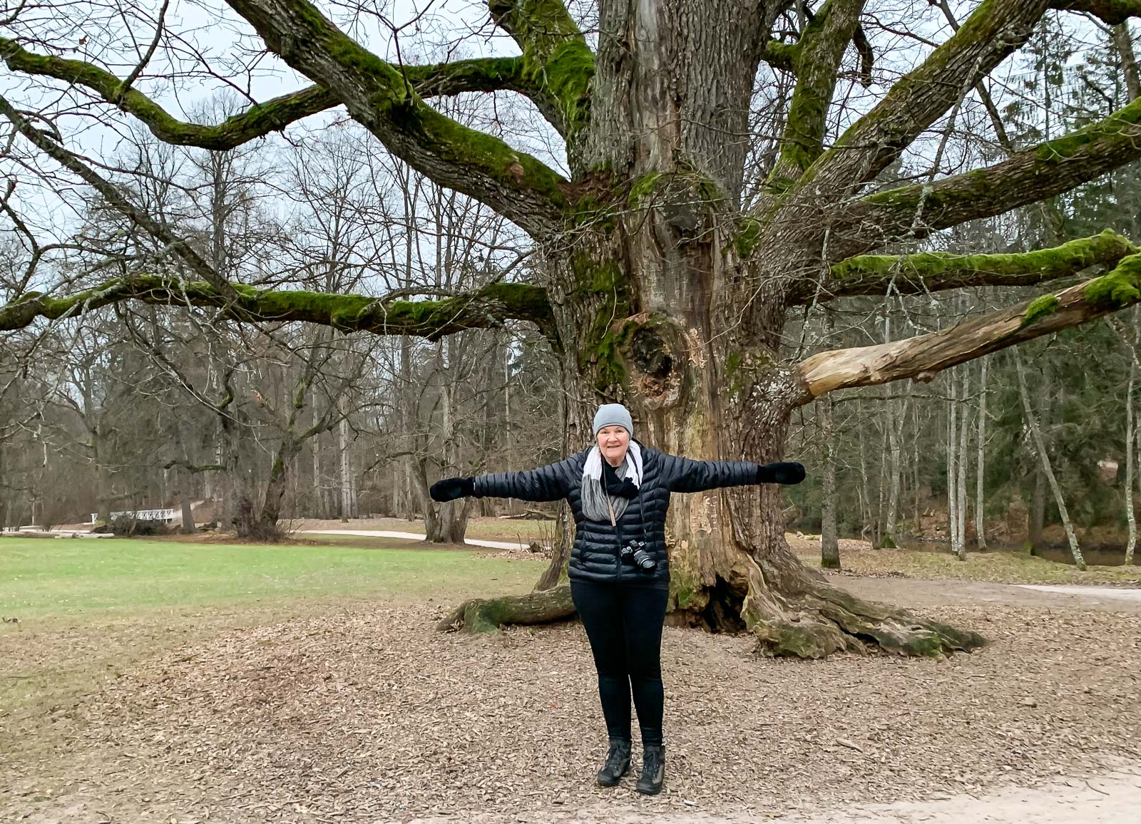 Träskandan kartanon puistossa pysähdymme vielä hetkeksi Espoon paksuimman puun, vanhan tammen luona ja käännämme sitten katseemme kartanoon. Valot ikkunoissa alkavat vähitellen näkyä illan pimetessä.