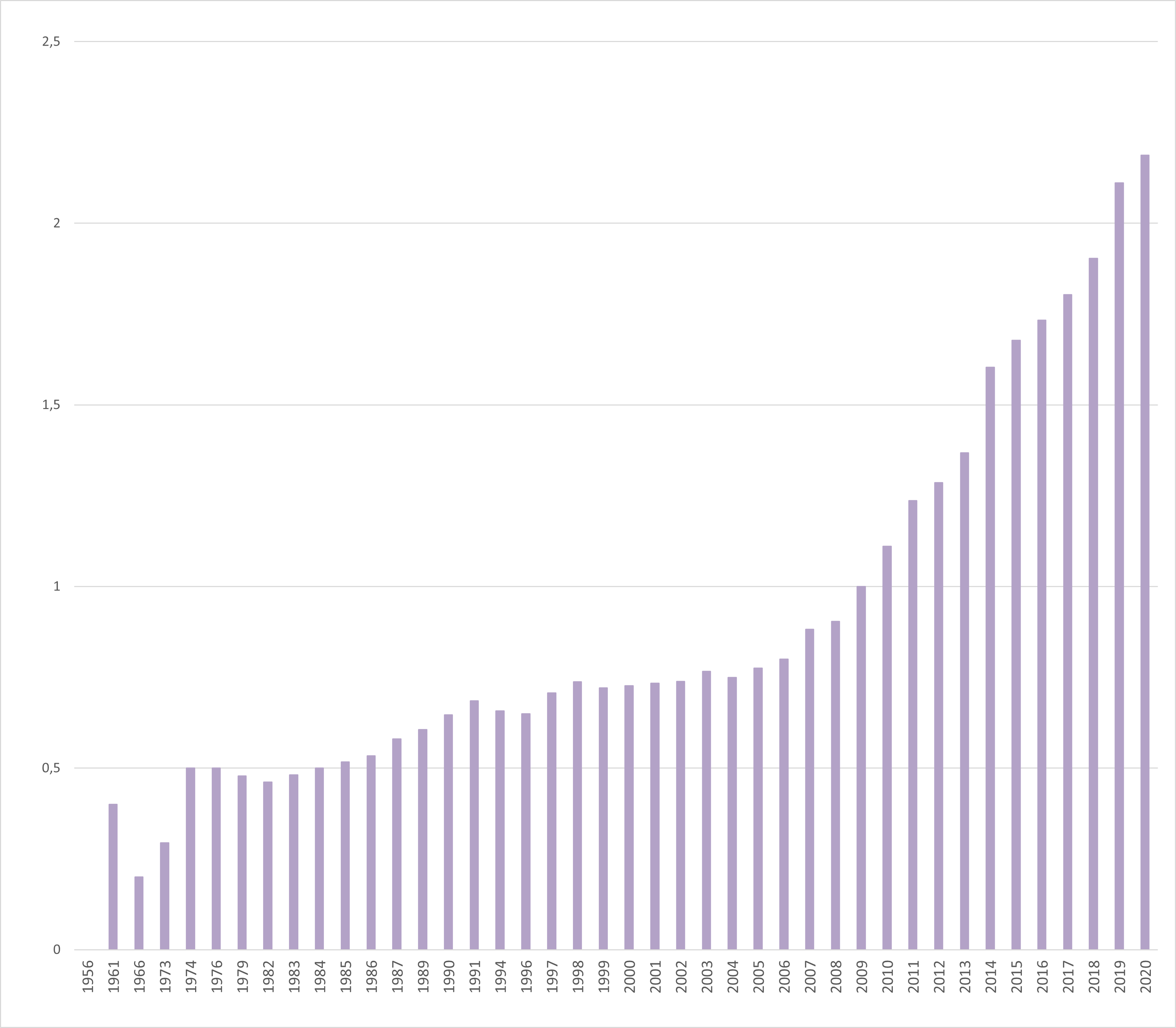 Nyt ollaan lukemassa 2,2 – eli tänä vuonna pitäisi pystyä käymään ainakin kahdessa uudessa maassa, ettei kerroin kääntyisi laskuun – mutta tänä toisena koronavuonna saattaa hyvin olla, ettei tähänkään päästä.
