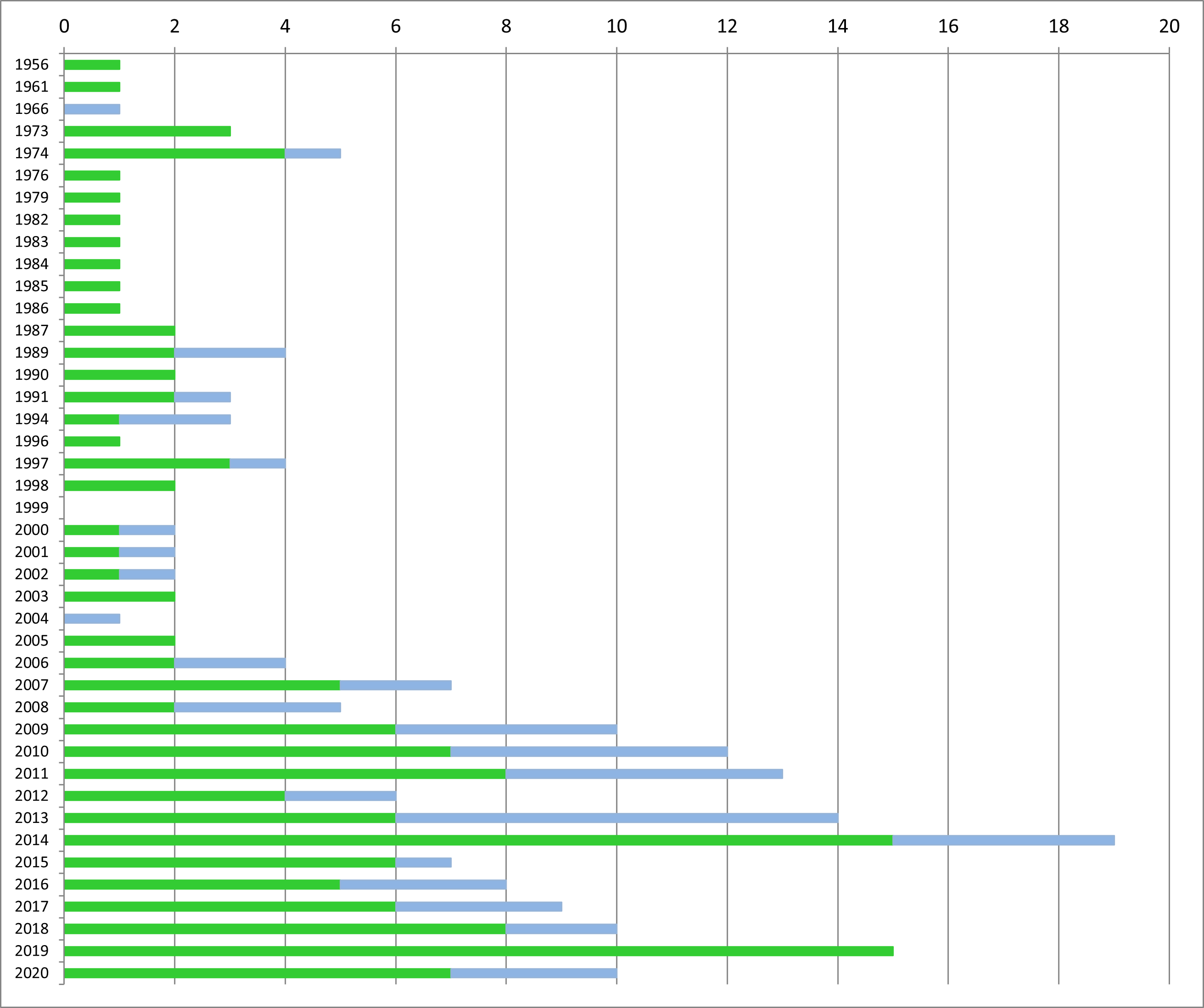 Vuosi 2020 ei maabongausnumeroiden osalta ollut sittenkään niin huono, mitä olisi voinut käytännössä vain kolmeen kuukauteen kutistuneen matkailuvuoden jäljiltä: 4 uutta maata ja niiden lisäksi 3 uutta TCC-aluetta. Näiden myötä vuodenvaihteen lukemat olivat (P/L):