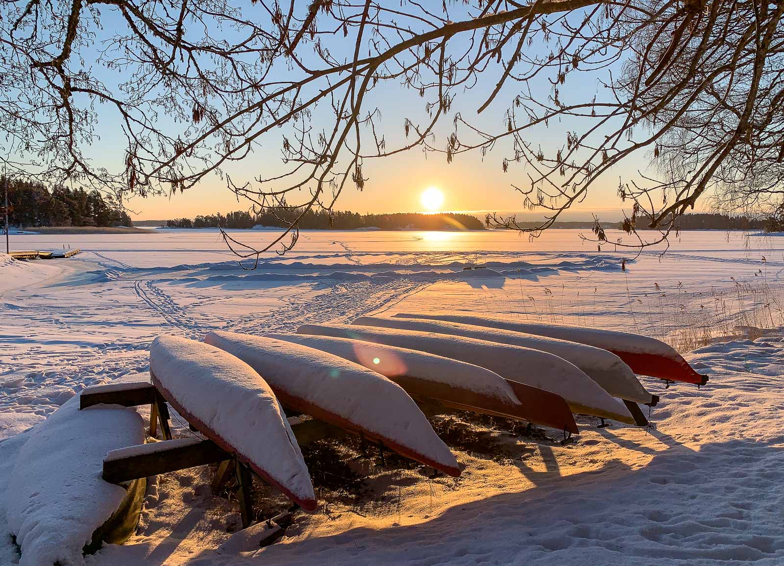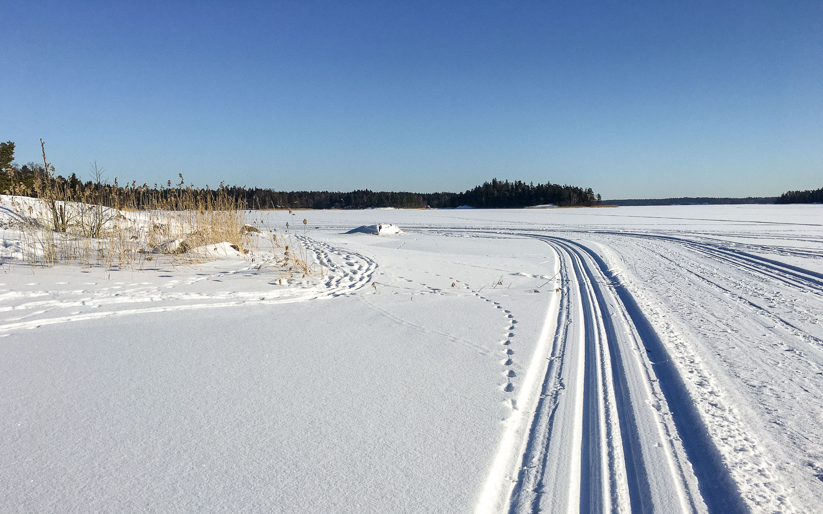 Meri on jäässä. Ulkona paukkuu pakkanen, mutta talviaurinkokin paistaa häikäisevän kirkkaasti ja lämmittää hiihtäjän selkään paistaessaan. Hiihtämme Rågön saaren rannan tuntumassa, Snappertunassa, Raaseporissa. Rannan kesämökit ovat vielä tyhjillään, kauniit laiturit rytmittävät matkaamme meren jäällä, kaislikon tuntumassa. Eläinten jälkiä on paljon: täällä on ainakin peuroja, mutta paikalliset kertovat meille myöhemmin, että ovat nähneet täällä myös susia, jopa ilveksenkin. Kotikulmillamme Iirislahdessakin on tänä vuonna päässyt hiihtämään meren jäälläkin, mutta kaupungissa myös jäällä on niin paljon kulkijoita, että ladut tallautuvat askelista. Täällä, Calliolassa, ladut ovat ensiluokkaisessa kunnossa.