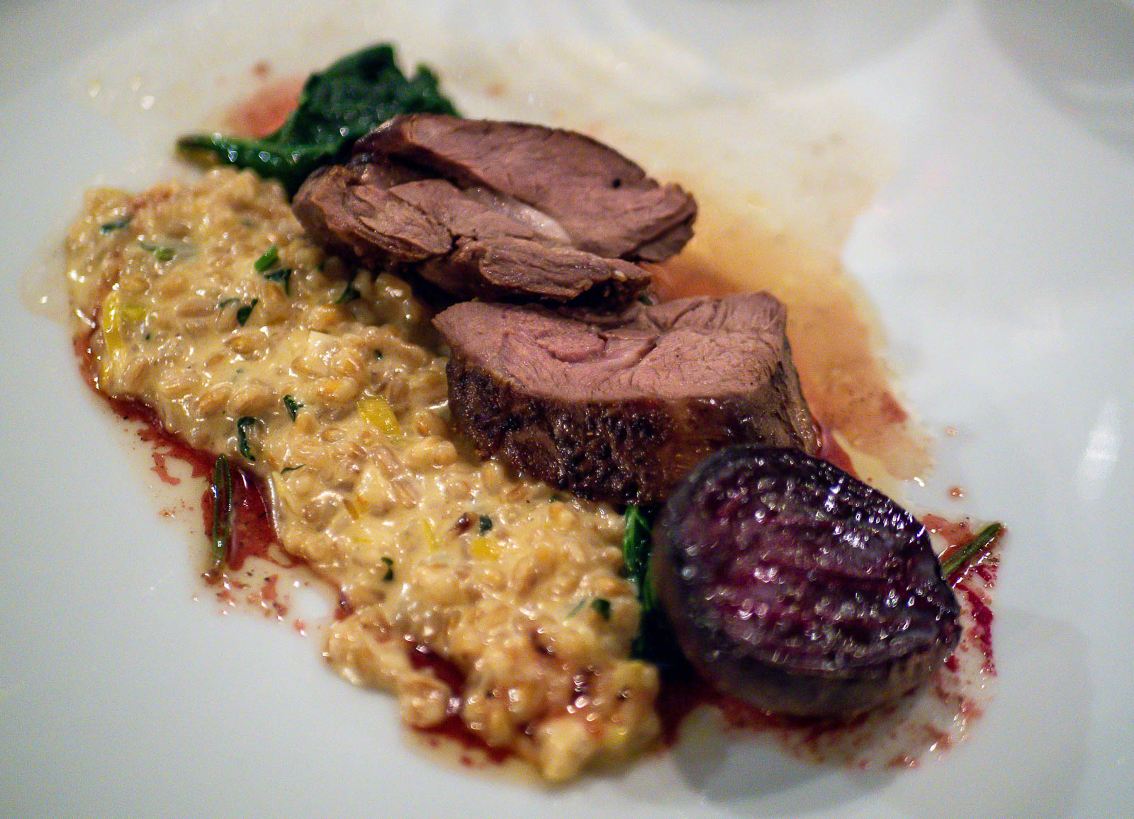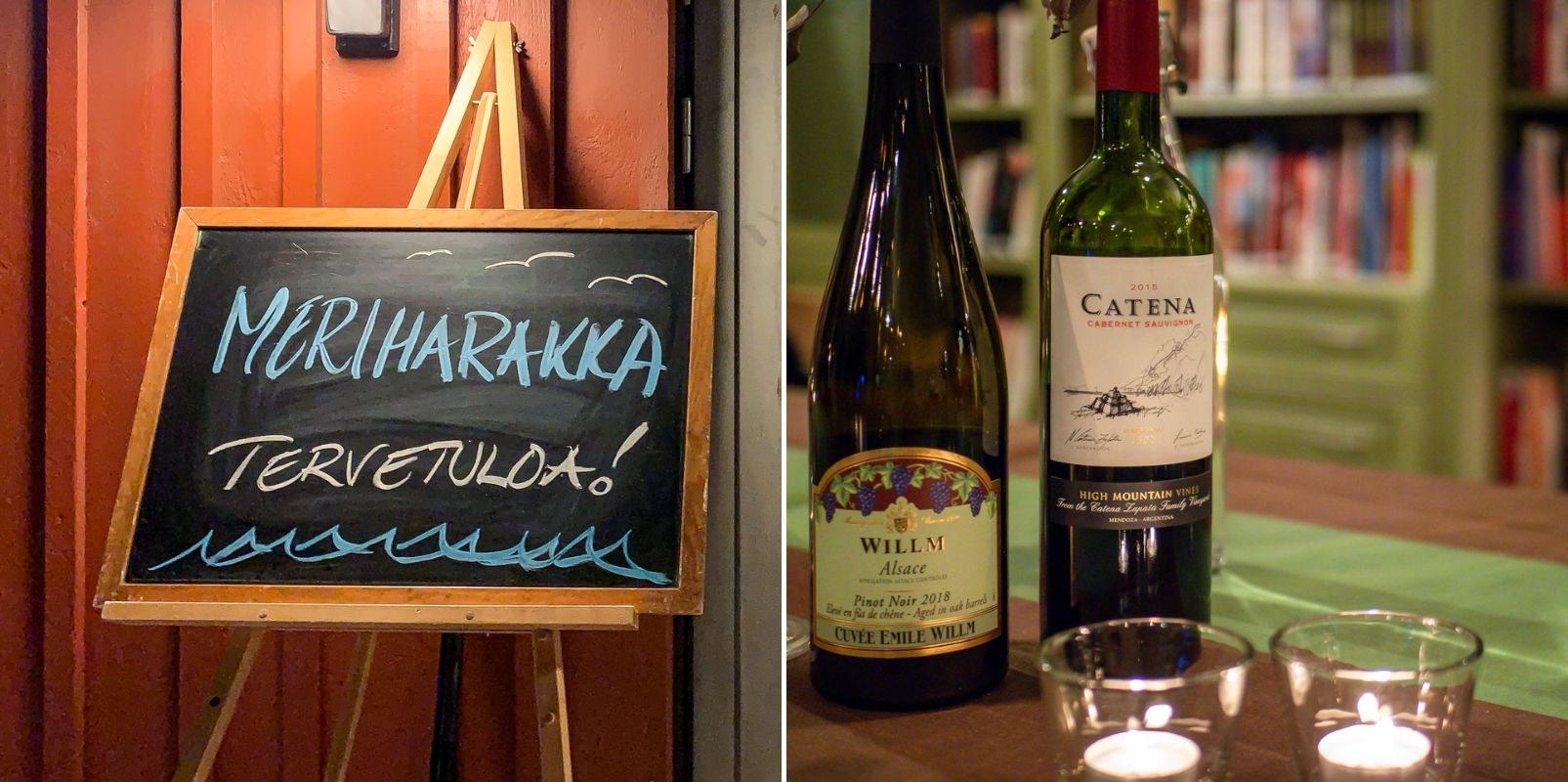 Hiihtoretken jälkeen virittäydymme talviseen mökkitunnelmaan takan ääressä auringon painuessa mailleen. Mökissä olisi hyvin varusteltu keittiökin, mutta olemme silti jo etukäteen päättäneet ruuan osalta luottaa Calliolan ammattilaisiin ja illan pimetessä hipsimme illalliselle ravintolaan. Calliolan ravintolatilat ovat avarat, pystyväthän he normaalioloissa majoittamaan ja ruokkimaan jopa 70 henkeä, joten jokaiselle seurueelle löytyy helposti oma tilansa. Emme iltapäivällä onnistuneet näkemään jäällä peuroja, mutta joku oli jossain täällä päin niitä nähnyt ja onnistunut niistä muutaman ampumaankin, sillä lautasillemme päätyi peuraa parissakin muodossa, osso buccona ja pääruokana risoton kanssa. Tukevaa liharuokaa siis urheilun jälkeen, mutta riistana kuitenkin kevyempää kuin nauta tai porsas. Aterian kruunaa lakritsihyytelö ja pihlajanmarjavaahto, lähiruokaa nekin. Tai kruunaa ja kruunaa, täällä leivottu saaristoleipä, jossa on mukana myös karpalosattumia on sekin satumaisen hyvää. Leivomme kotona joskus saaristoleipää valmiista Tuoppi saaristolaisleipäseoksesta. Seuraavalla kerralla siihenkin tulee päätymään myös karpaloita!