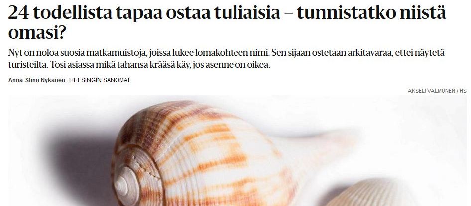 Anna-Stina Nykäsen juttu 24 todellista tapaa ostaa tuliaisia – tunnistatko niistä omasi ? sunnuntain Helsingin Sanomissa 17.7.2016 haastoi…
